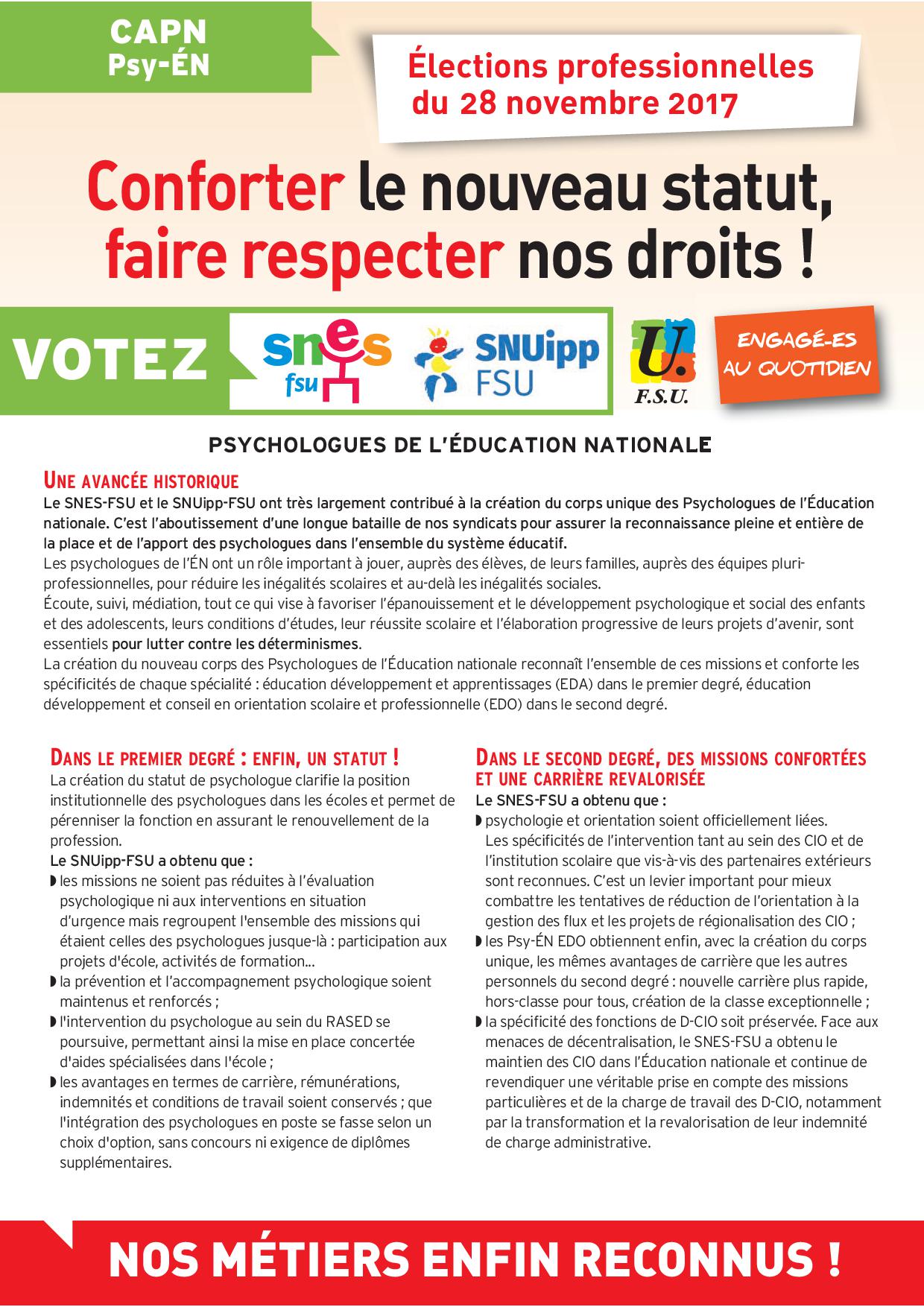 Avec la création du corps unique des Psychologues au 1er septembre 2017, sont organisées des élections professionnelles pour la désignation des représentants du personnel aux commissions administratives paritaires académique (CAPA) et nationale (CAPN) compétentes à l’égard des psychologues de l’Education nationale.