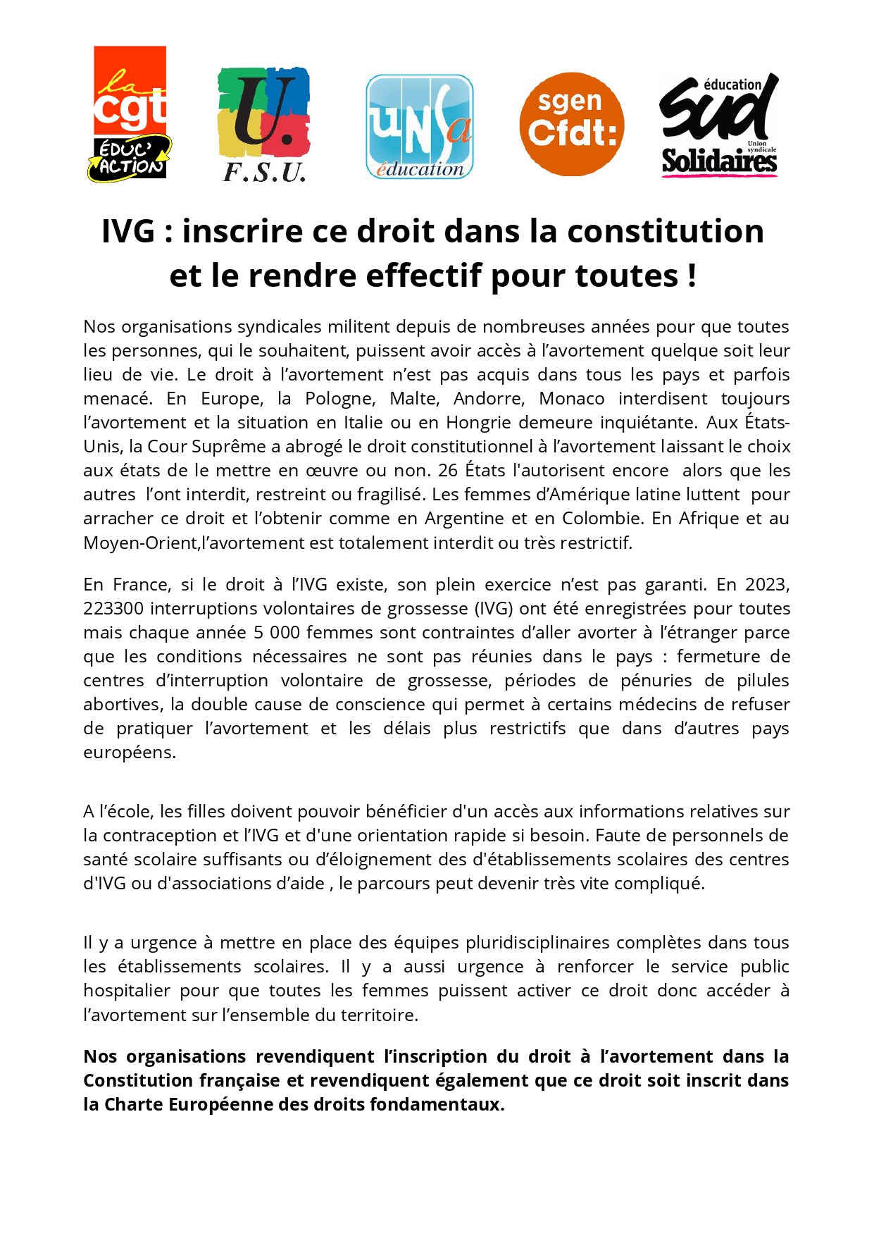 Nos organisations syndicales militent depuis de nombreuses années pour que toutes les personnes, qui le souhaitent, puissent avoir accès à l’avortement quelque soit leur lieu de vie.