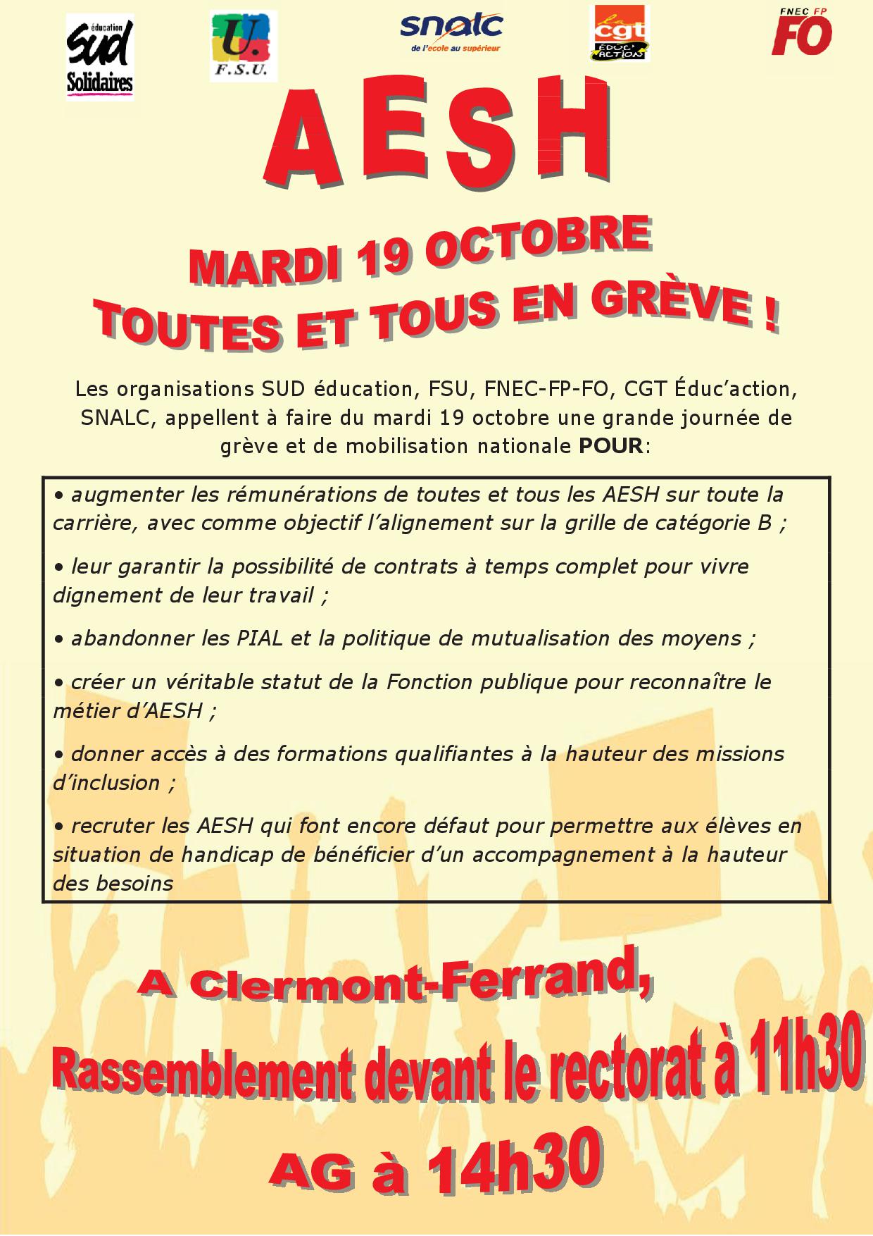 La FSU, SUD Education, la CGT et le SNALC appellent à se rassembler devant le rectorat de Clermont mardi 19 octobre à partir de 11h30. Une audience au recteur a été demandée. Une AG des personnels est prévue à 14h30.
