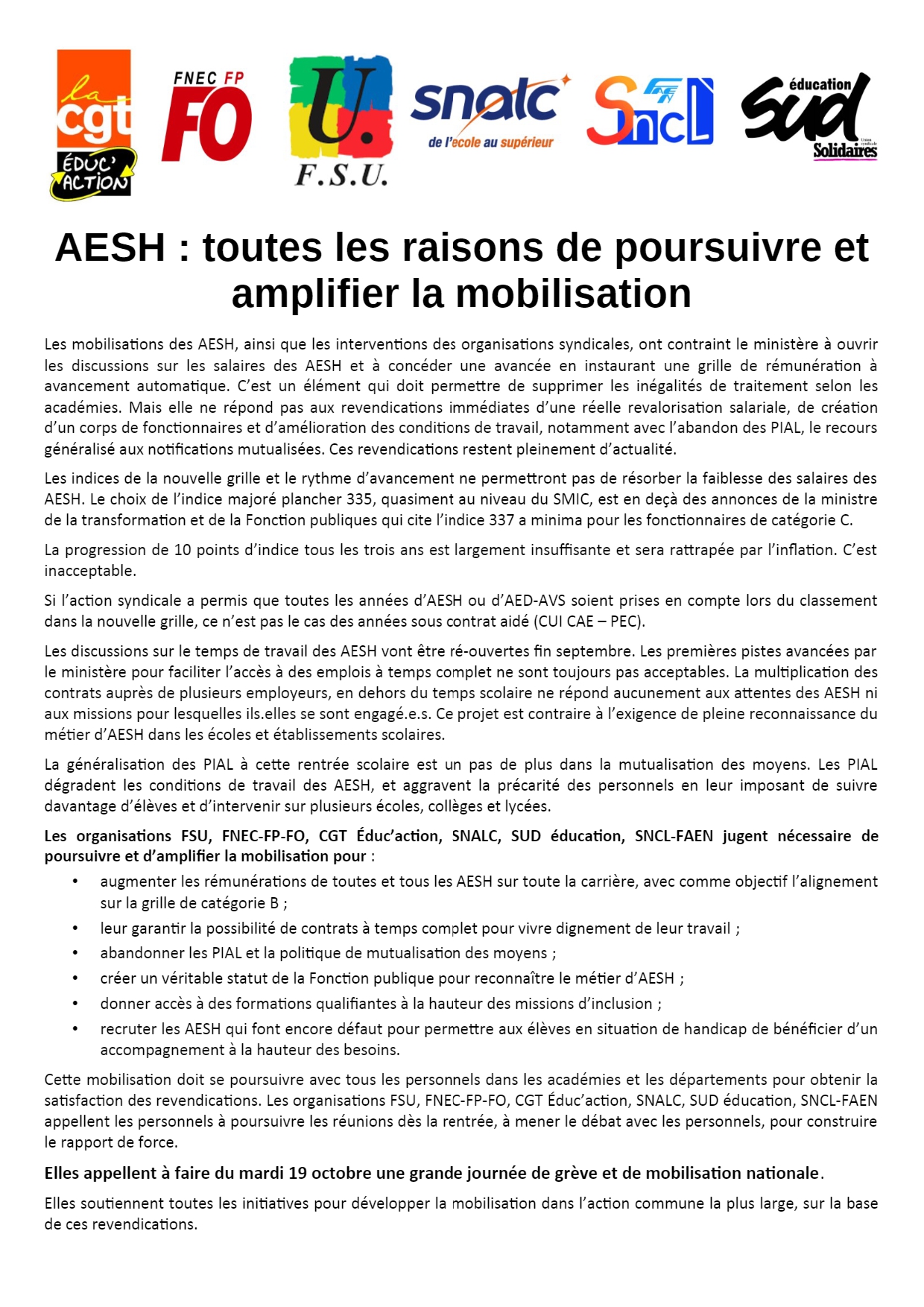 Vous êtes ici : Accueil Actualités actions Communiqués de Presse AESH : appel intersyndical à la grève mardi 19 octobre 4 septembre 2021 Actualités actions AESH : appel intersyndical à la grève mardi 19 octobre Imprimer l'article Communiqué intersyndical FSU, CGT, FO, Snalc, Sud Education, SNCL