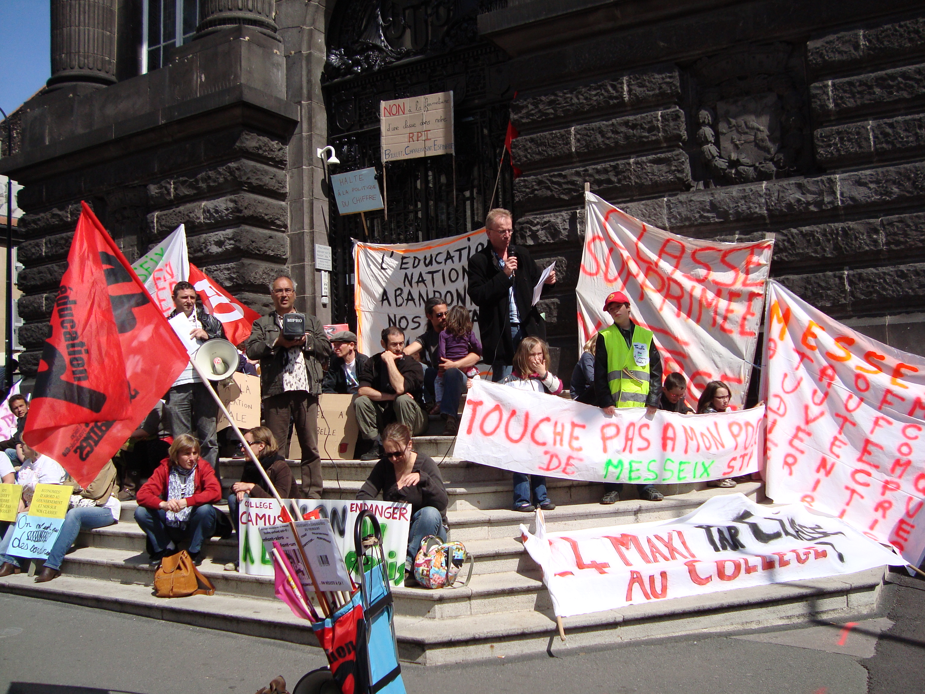 Le Conseil Départemental de l’Education Nationale du Puy de Dôme s’est réuni le 13 avril après avoir été boycotté le 8 avril. Un rassemblement de 300 personnes à l’appel des organisations syndicales et de la FCPE se tenait devant la préfecture et a manifesté bruyamment son opposition aux mesures de carte scolaire proposées par l’Inspecteur d’Académie.