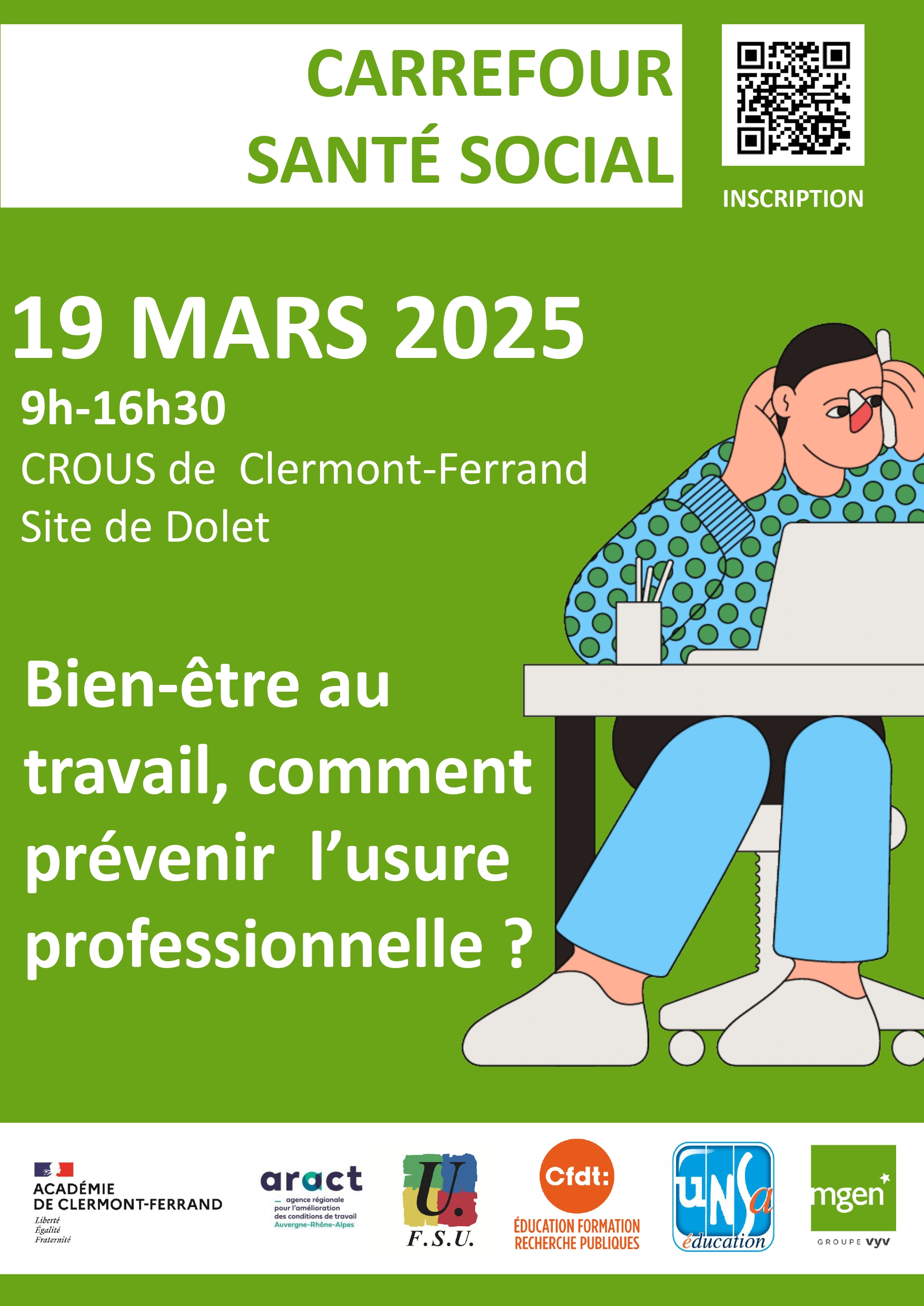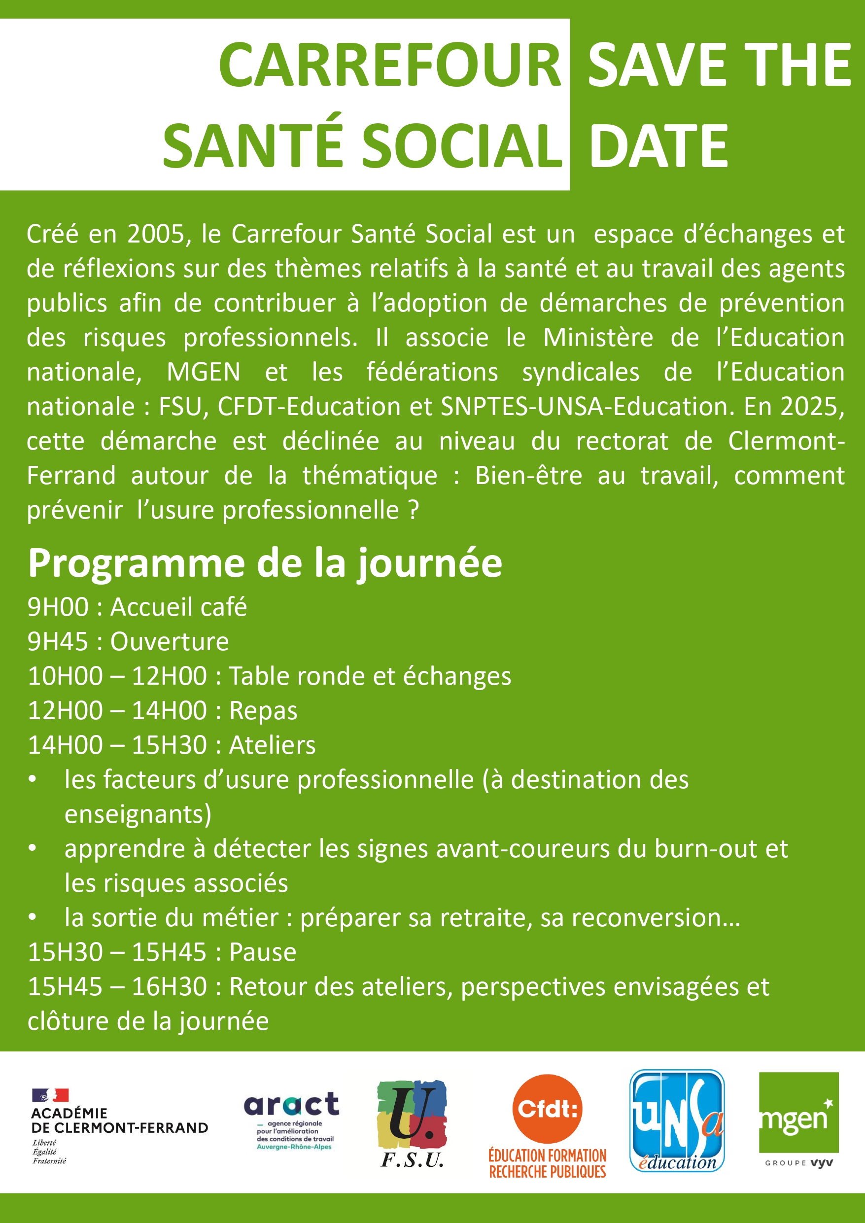 Il associe le Ministère de l’Education nationale, la MGEN et les fédérations syndicales de l’Education nationale : FSU, CFDT-Education et SNPTES-UNSA-Education. En 2025, cette démarche est déclinée au niveau du rectorat de Clermont-Ferrand autour de la thématique : Bien-être au travail, comment prévenir l’usure professionnelle ?