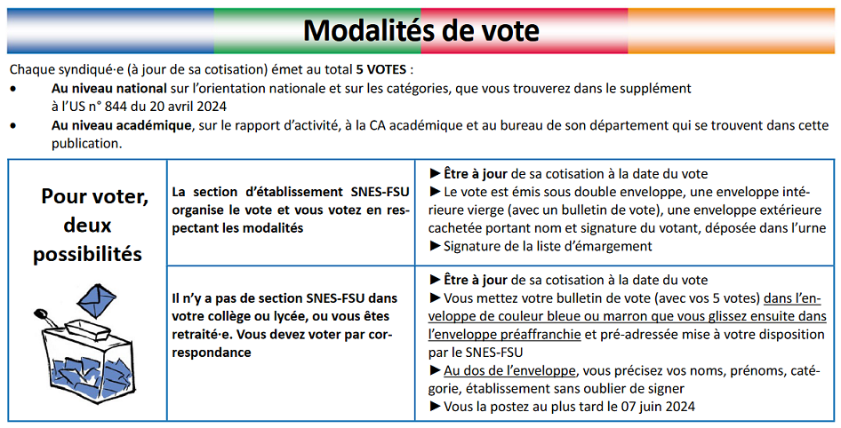 – Les syndiquées actifsves votent dans leur S1 si le vote est organisé ou par correspondance avec le matériel qu’ils et elles recevront prochainement.