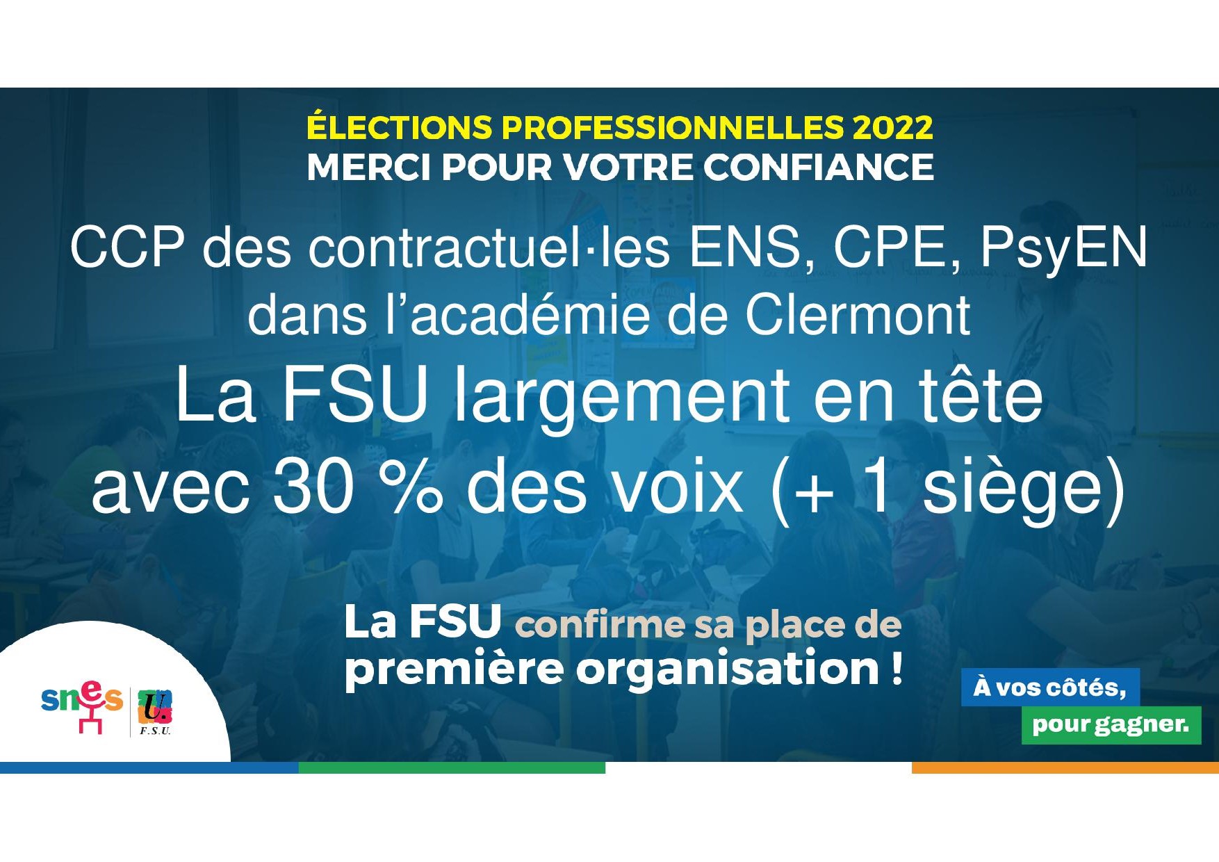 A la CCP des contractuel•les enseignant•es, CPE, PsyEN, la FSU est largement en tête avec 30% des voix gagnant ainsi 1 siège supplémentaire soit 2 sur 4.