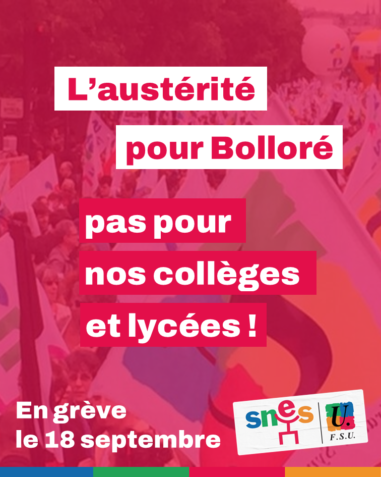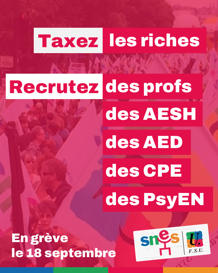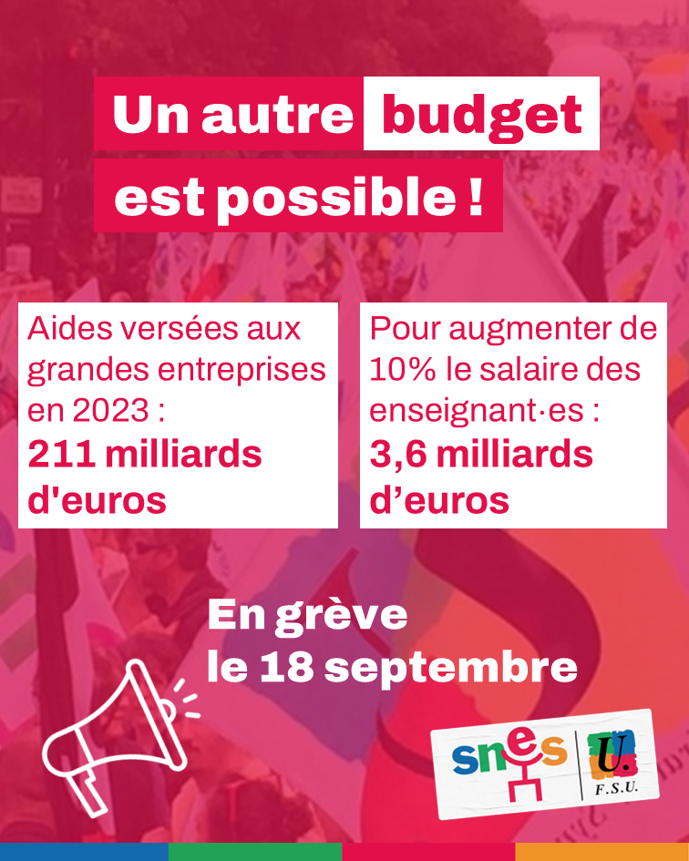 Après le 10 septembre, construisons un puissant mouvement social pour gagner un changement de cap budgétaire : contre l’austérité, pour nos salaires, nos carrières et nos métiers. Toutes et tous en grève à l’appel de l’intersyndicale nationale CGT, CFDT, FO, CFE-CGC, FSU, Solidaires, UNSA, CFTC !
