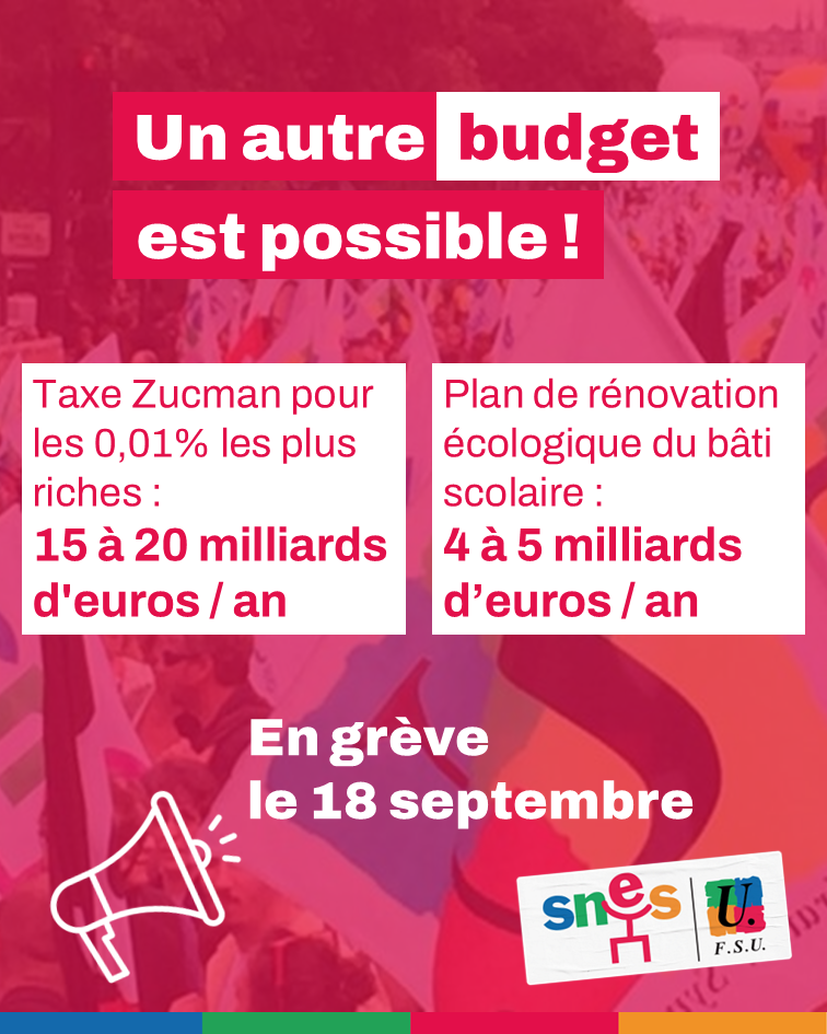 Ces choix peuvent être financés : ainsi la taxe Zucman (un impôt pour les personnes dont le patrimoine dépasse les 100 millions d’euros, c’est-à-dire 0,01 % des contribuables les plus riches, soit 1800 foyers fiscaux), pourrait rapporter entre 15 et 25 milliards d’euros. En 2023, le SNES-FSU avait estimé à 3,6 milliards d’euros l’augmentation de 10% promise par Emmanuel Macron…