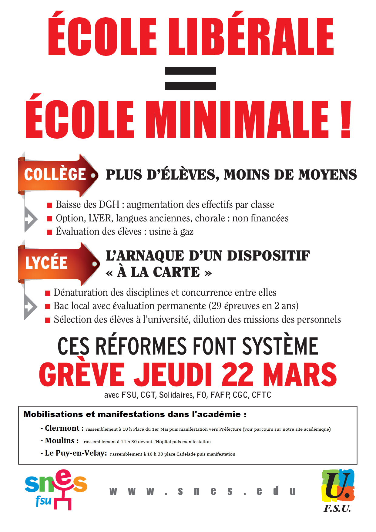 7 organisations syndicales dont la FSU appellent à une journée de grève le jeudi 22 mars, pour défendre le service public et le pouvoir d’achat des fonctionnaires. Dans le Puy-de-Dôme, les syndicats de la jeunesse UNEF, Solidaires étudiant-e-s et UNL se joignent à l’appel ainsi que le Sgen/CFDT et l’UNSA (Education, Santé et Territoriaux).