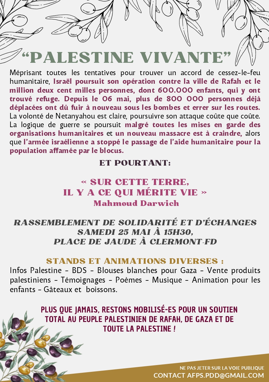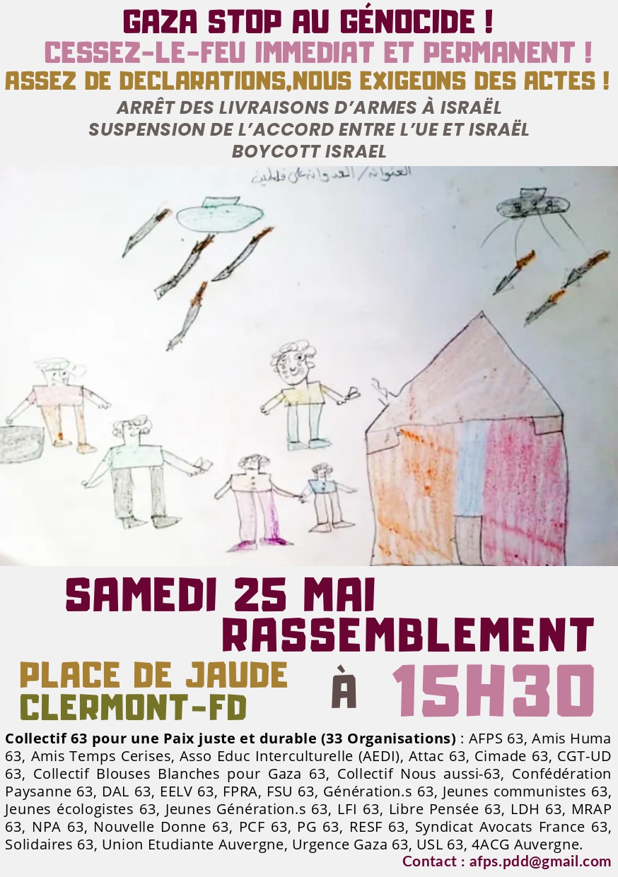 RASSEMBLEMENT DE SOLIDARITÉ ET D’ÉCHANGES SAMEDI 25 MAI À 15H30, PLACE DE JAUDE À CLERMONT-FD