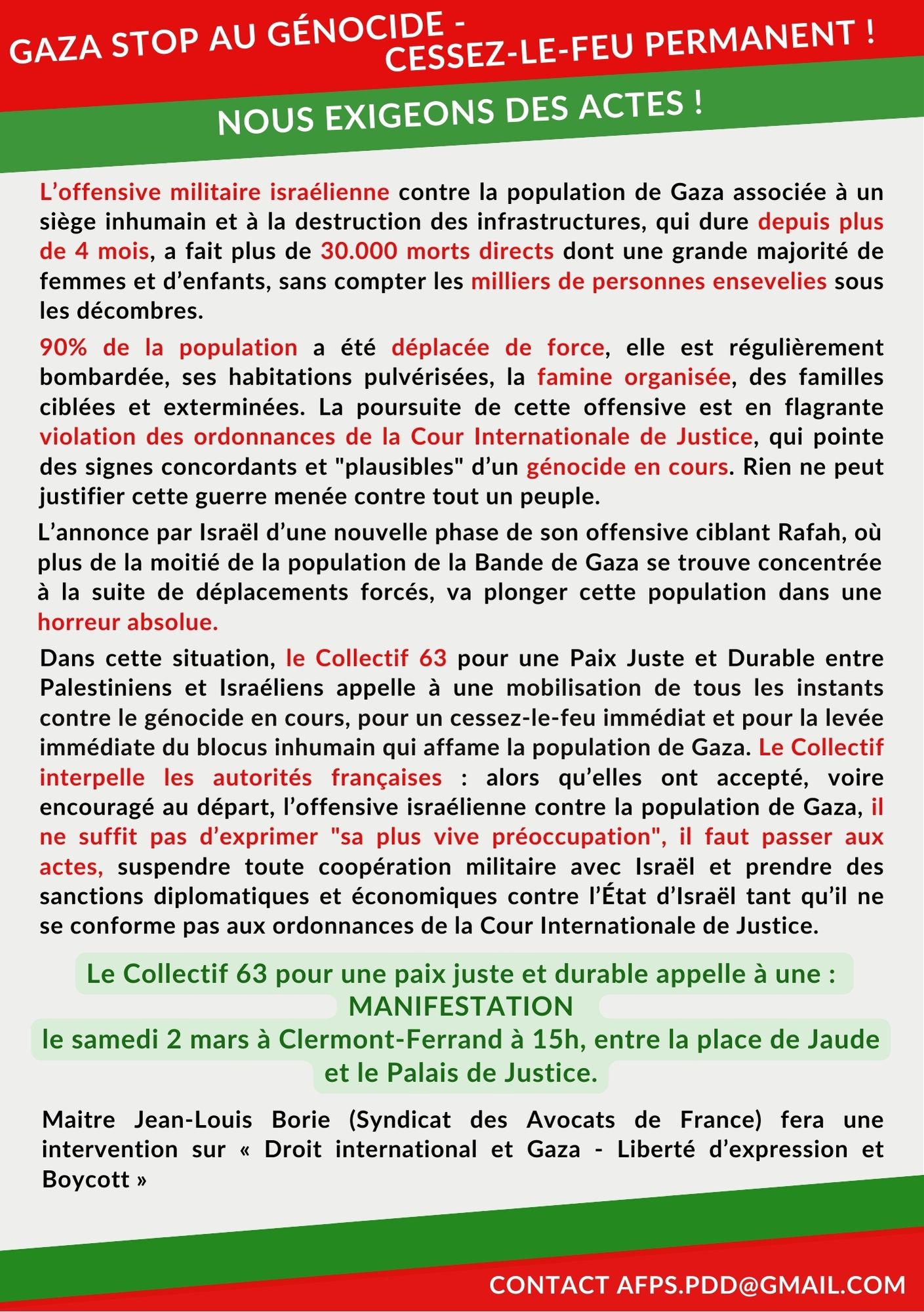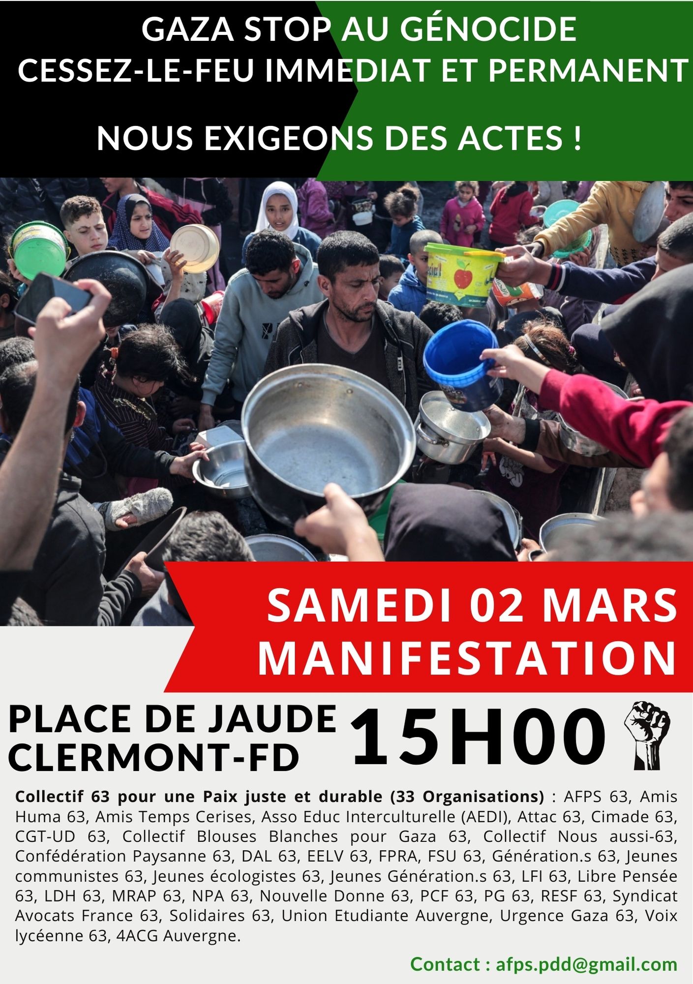 Vous êtes ici : Accueil Actualités actions Actualités Année en cours Gaza : stop au génocide ! Cessez-le-feu immédiat et permanent ! Manifestation départ Place de Jaude samedi 2 mars à 15h 27 février 2024 Actualités actions Gaza : stop au génocide ! Cessez-le-feu immédiat et permanent ! Manifestation départ Place de Jaude samedi 2 mars à 15h Imprimer l'article Stop au génocide ! Cessez-le-feu immédiat et permanent ! Nous exigeons des actes ! Manifestation samedi 2 mars départ Place de Jaude à 15h vers le Palais de Justice A l’appel du Collectif 63 pour une paix juste et durable.