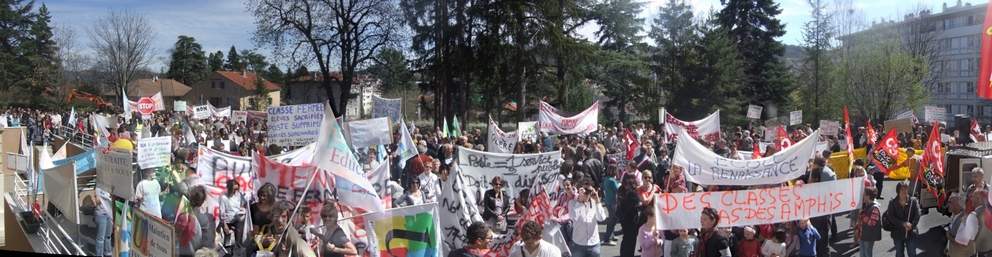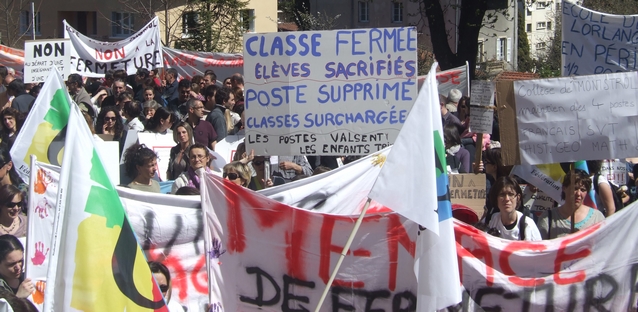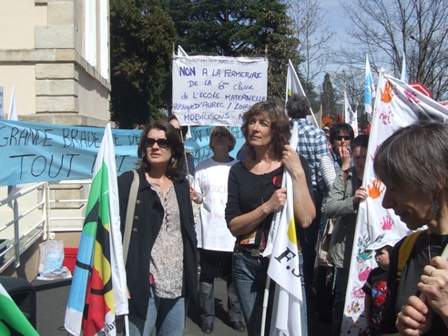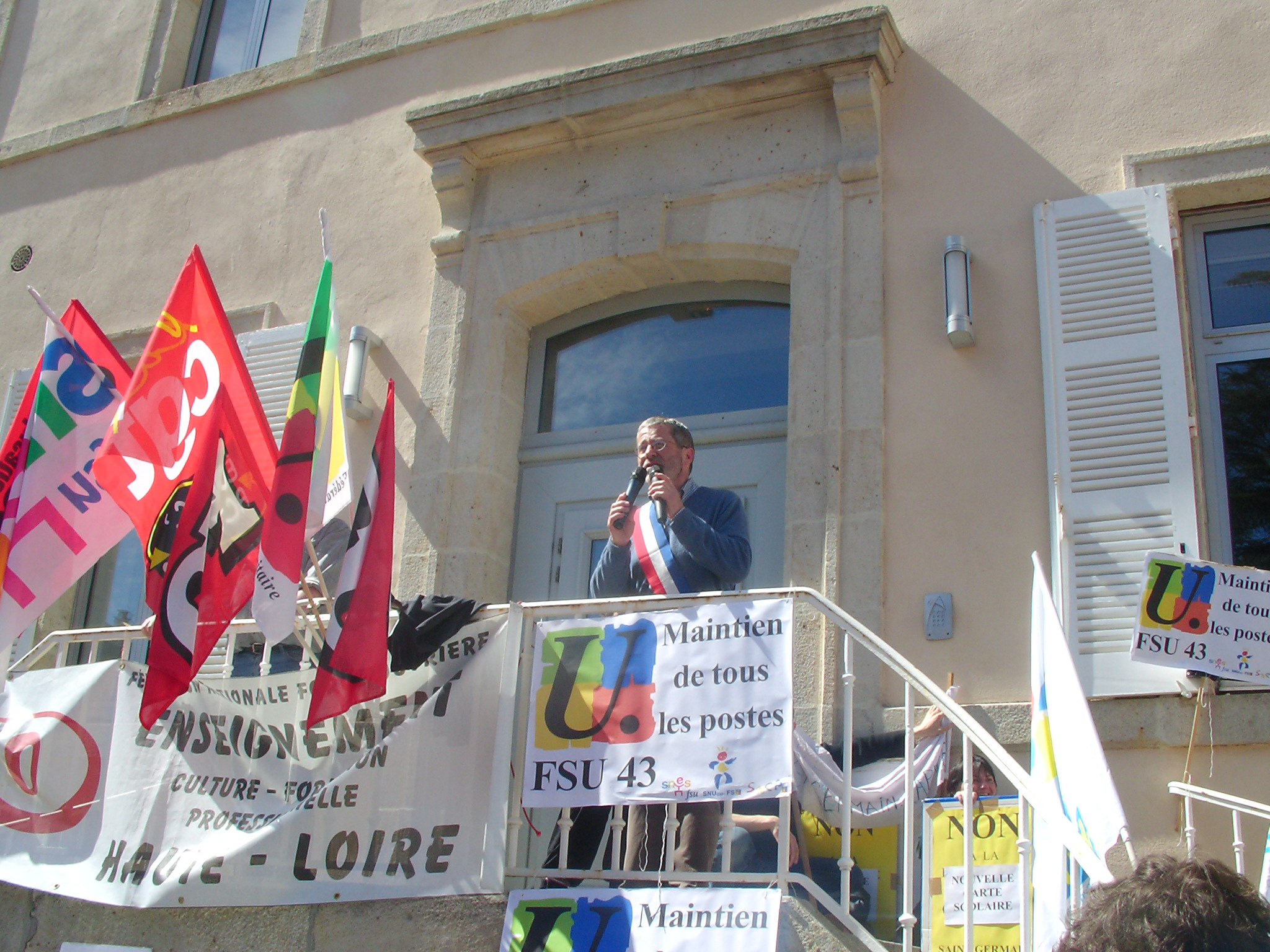 Entre 600 et 700 personne se sont retrouvées devant le bâtiment pour manifester leur mécontentement face à la proposition de crate scolaire dans le département. Des parents d’élèves, la FCPE de Haute-Loire, des élus locaux, une quinzaine quand même, et des collègues, essentiellement du primaire, sont venus exprimer leur "ras le bol" sur ce qui se passera à la rentrée prochaine au niveau de laqualité de l’accueil des enfants dans les écoles. Le maire d’ ALLEGRE a pris la parole au nom des maires présents pour dénoncer le "dépeçage" des moyens et "l’entassement" des enfants dans les classes.