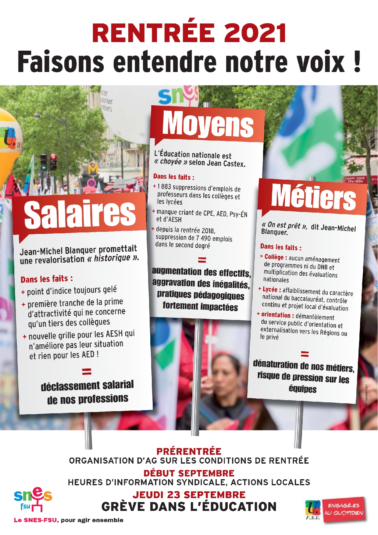 L’intersyndicale Éducation FSU, FO, CGT, SUD appelle à se mettre en grève le 23 septembre 2021 pour les postes, les salaires et l’amélioration des conditions de travail.