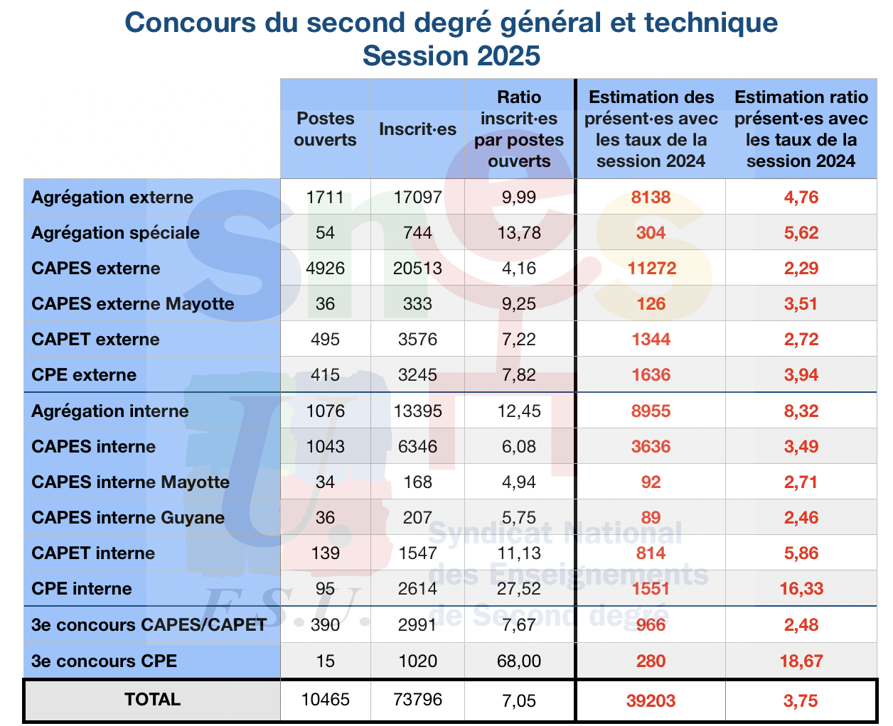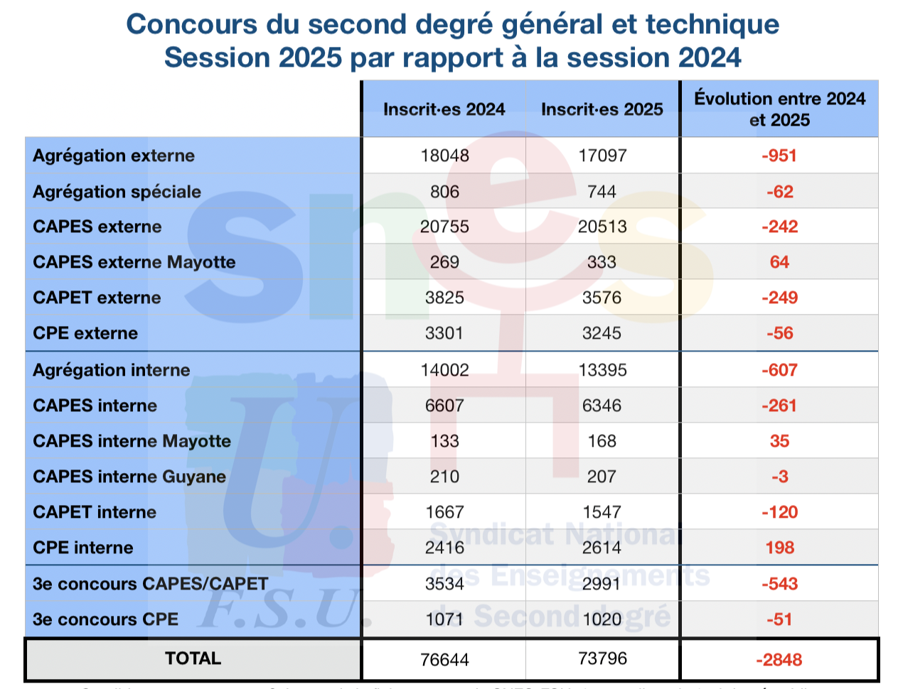 Après de nombreuses relances du SNES et de la FSU auprès du Ministère, celui-ci s’est finalement décidé à publier les chiffres des inscriptions aux concours pour la session 2025 le 14 février 2025… Soit plus de deux mois après la fin des inscriptions.