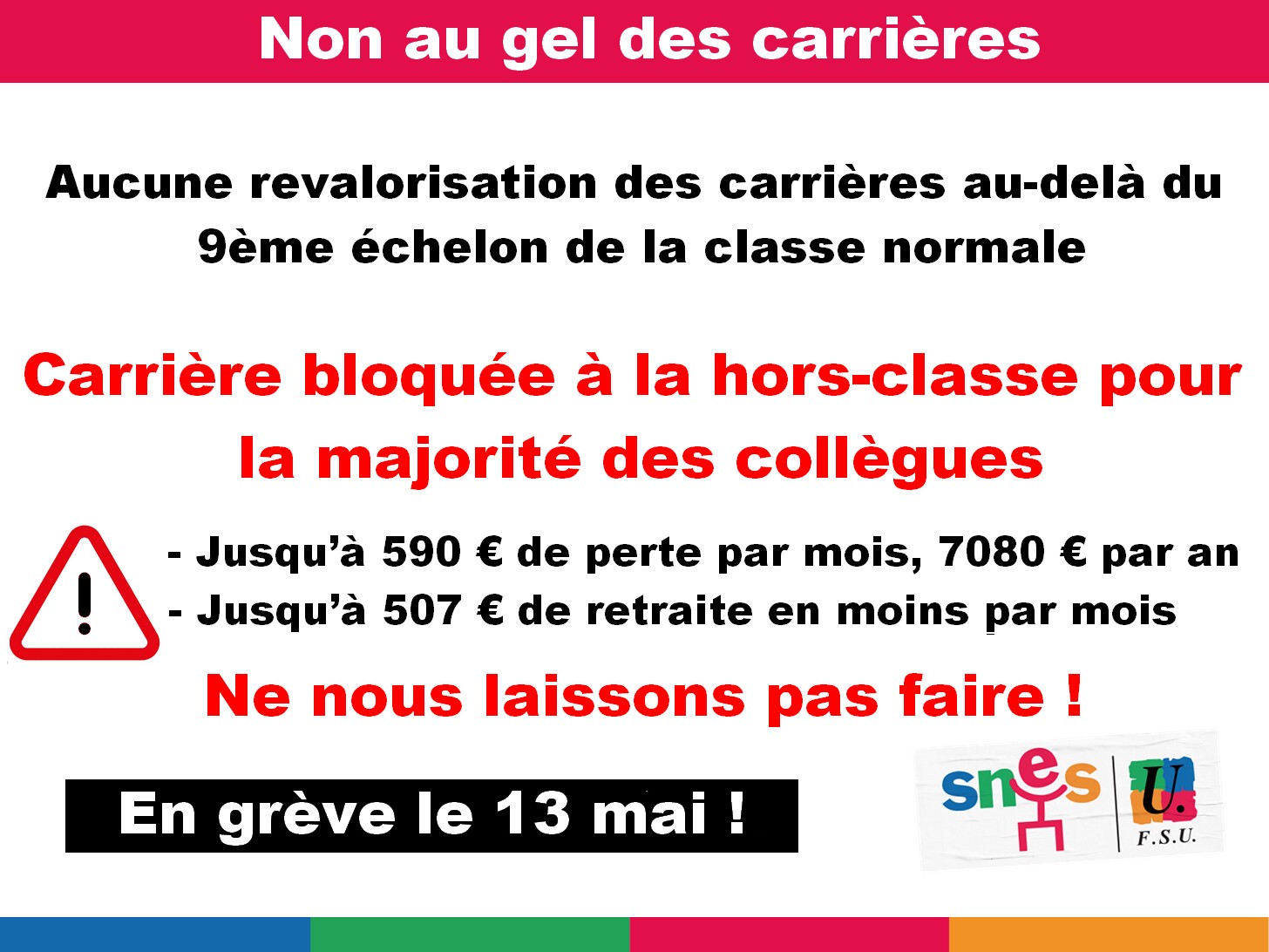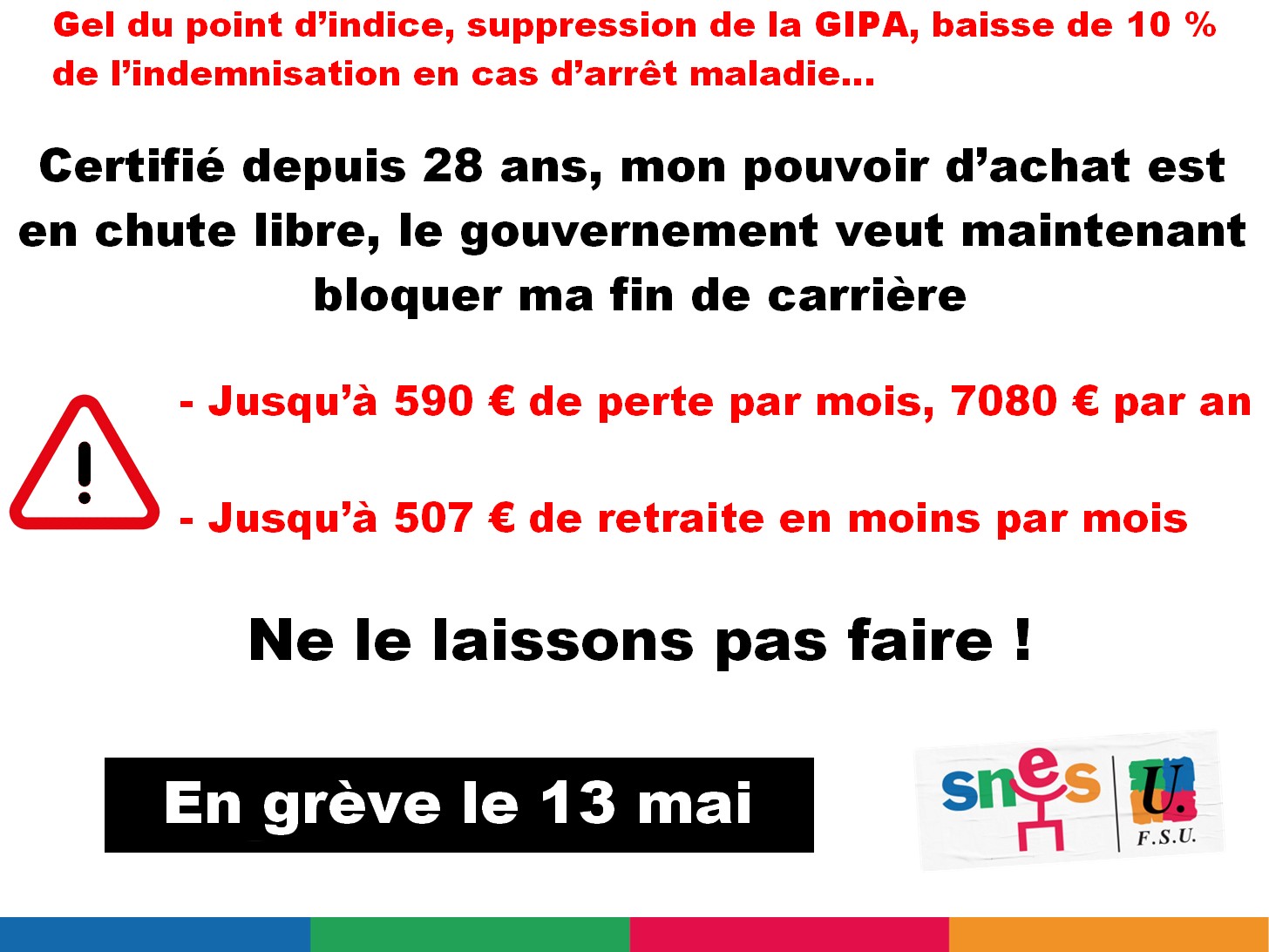 Dès maintenant, le SNES-FSU appelle à la grève et aux manifestations le mardi 13 mai. Mobilisons-nous pour nos salaires, nos carrières, nos métiers et refuser le budget d’austérité.
