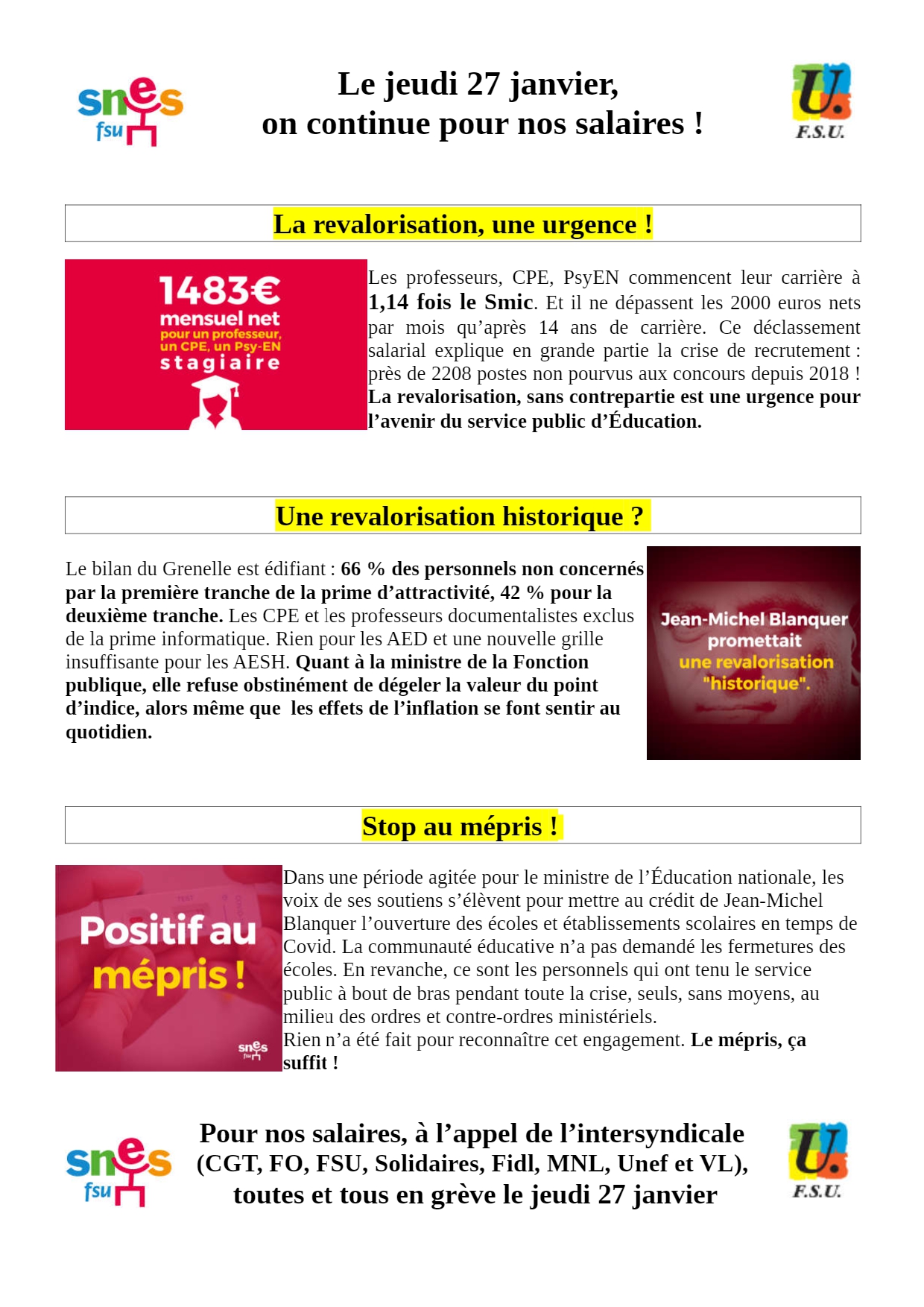 Alors que les personnels ont tenu le service public à bout de bras pendant toute la crise, rien n’a été fait pour reconnaitre cet engagement. Le mépris, ça suffit ! Jeudi 27 janvier, portons ce message clair : augmentez nos salaires !