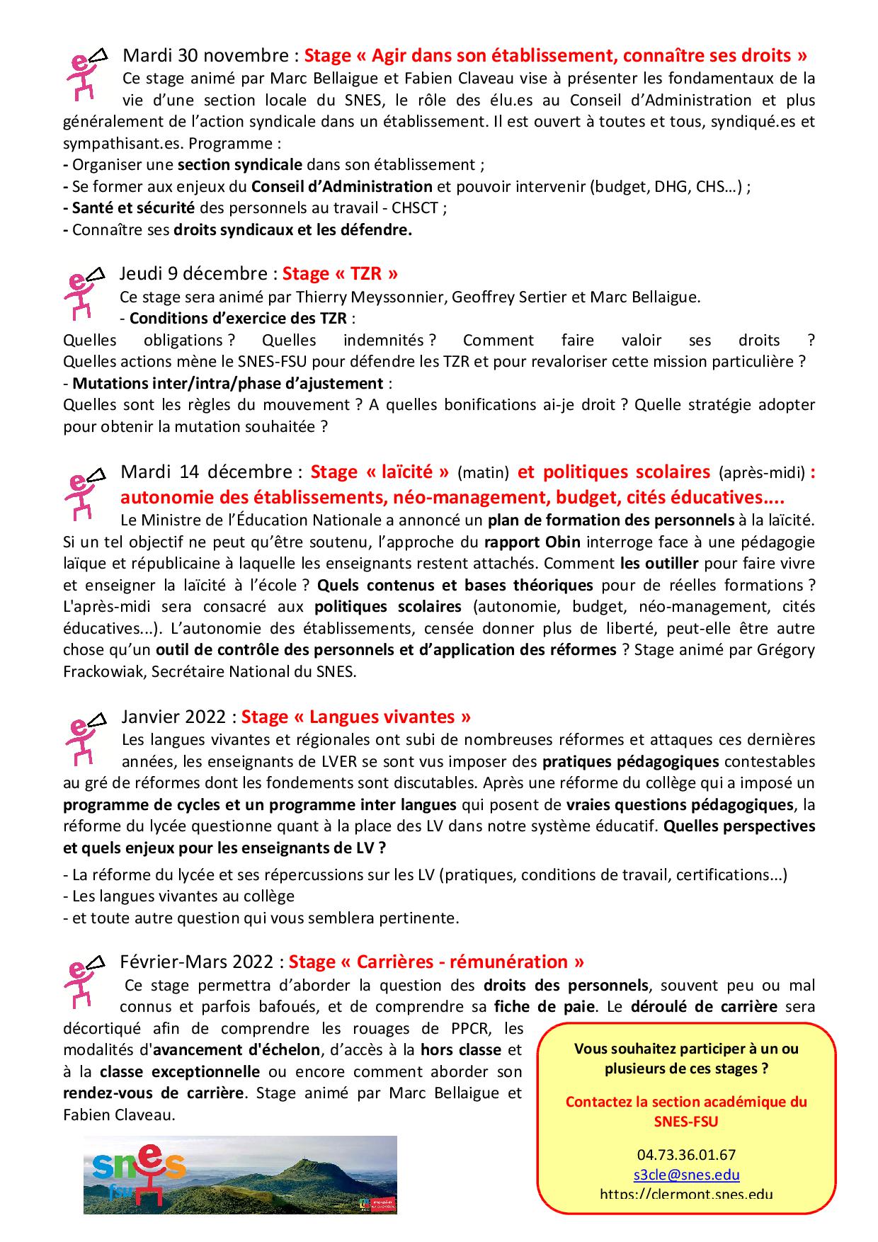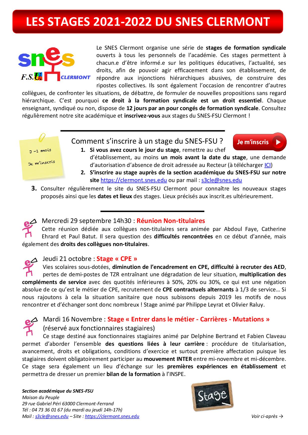 3. Consulter régulièrement le site du SNES-FSU Clermont pour connaître les nouveaux stages proposés ainsi que les dates et lieux des stages. Lieux précisés aux inscrit.es ultérieurement.