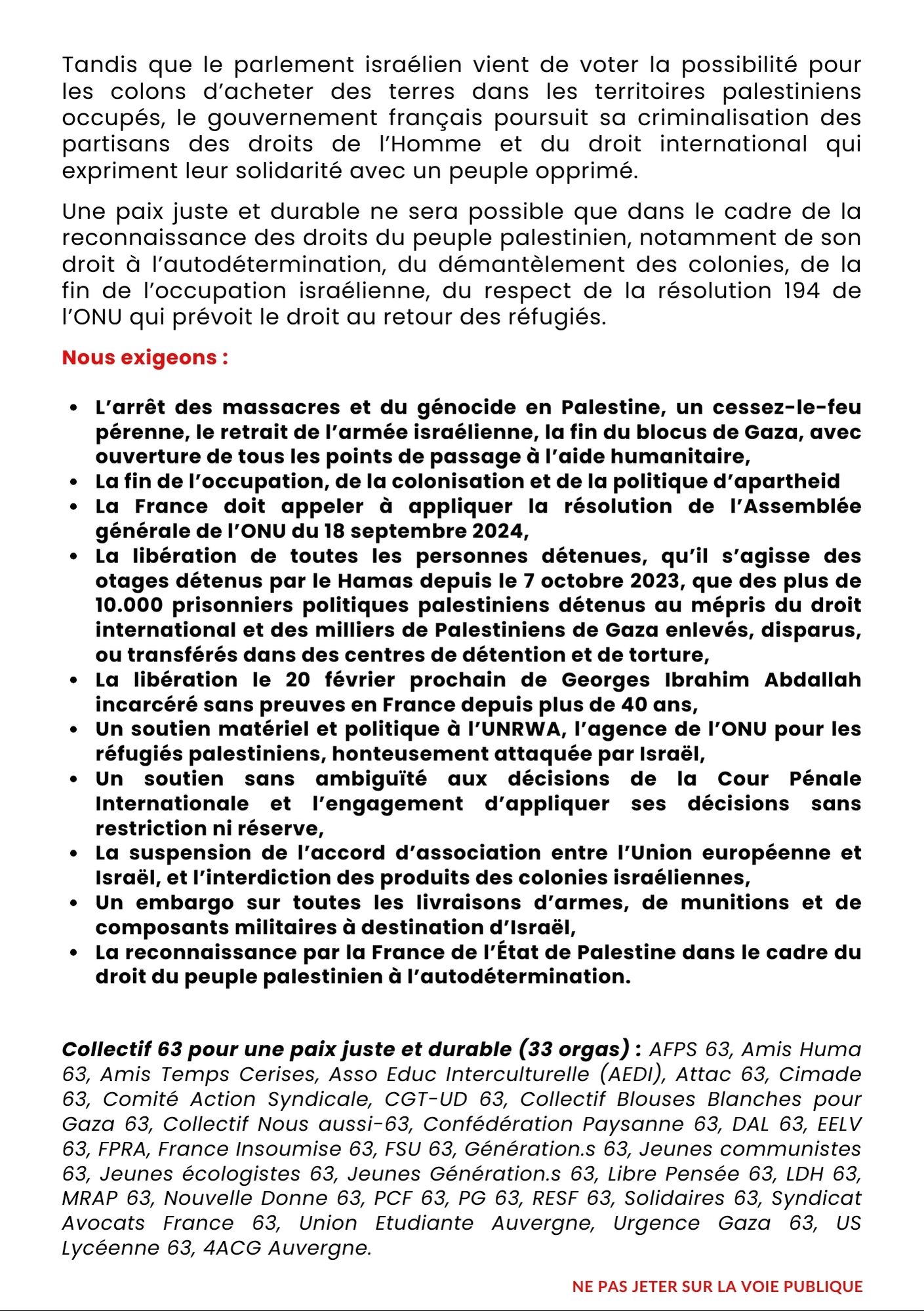 à l’appel du COLLECTIF 63 pour une paix juste et durable