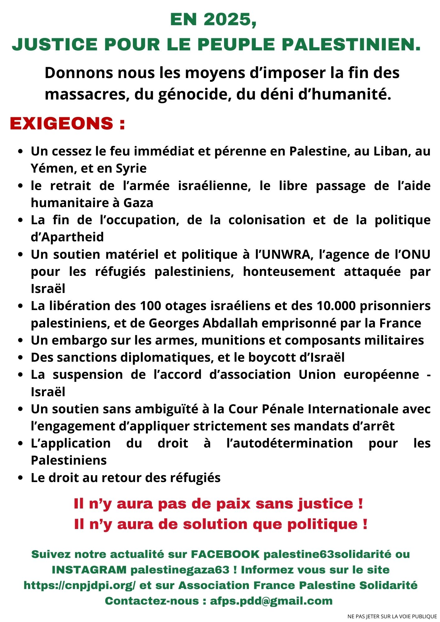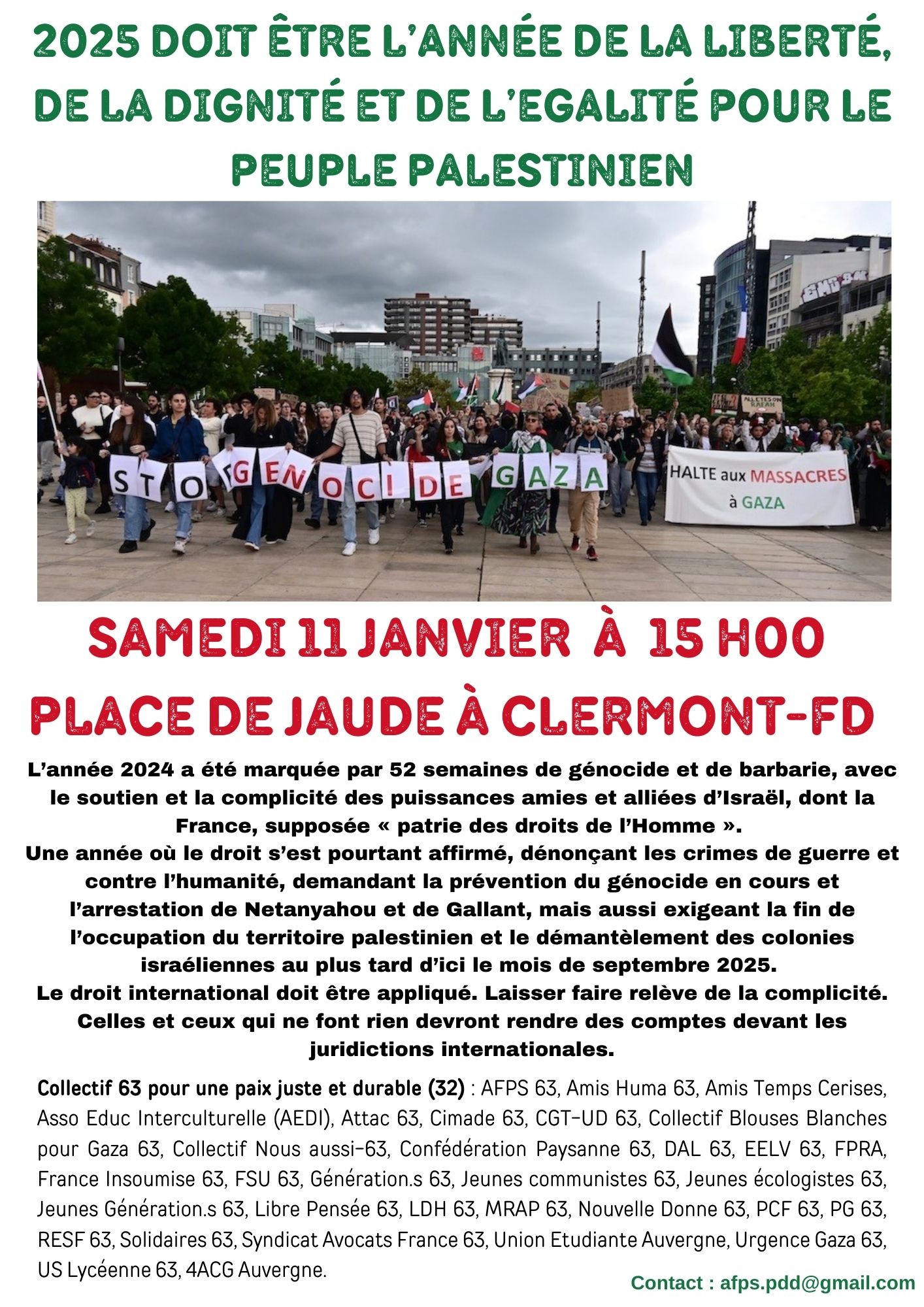 Vous êtes ici : Accueil Actualités actions Actualités Année en cours En 2025, justice pour le peuple palestinien ! Manifestation samedi 11/01 place de Jaude à 15h 10 janvier 2025 Actualités actions En 2025, justice pour le peuple palestinien ! Manifestation samedi 11/01 place de Jaude à 15h Imprimer l'article MANIFESTATION SAMEDI 11 JANVIER départ à 15h, place de Jaude à CLERMONT-FERRAND