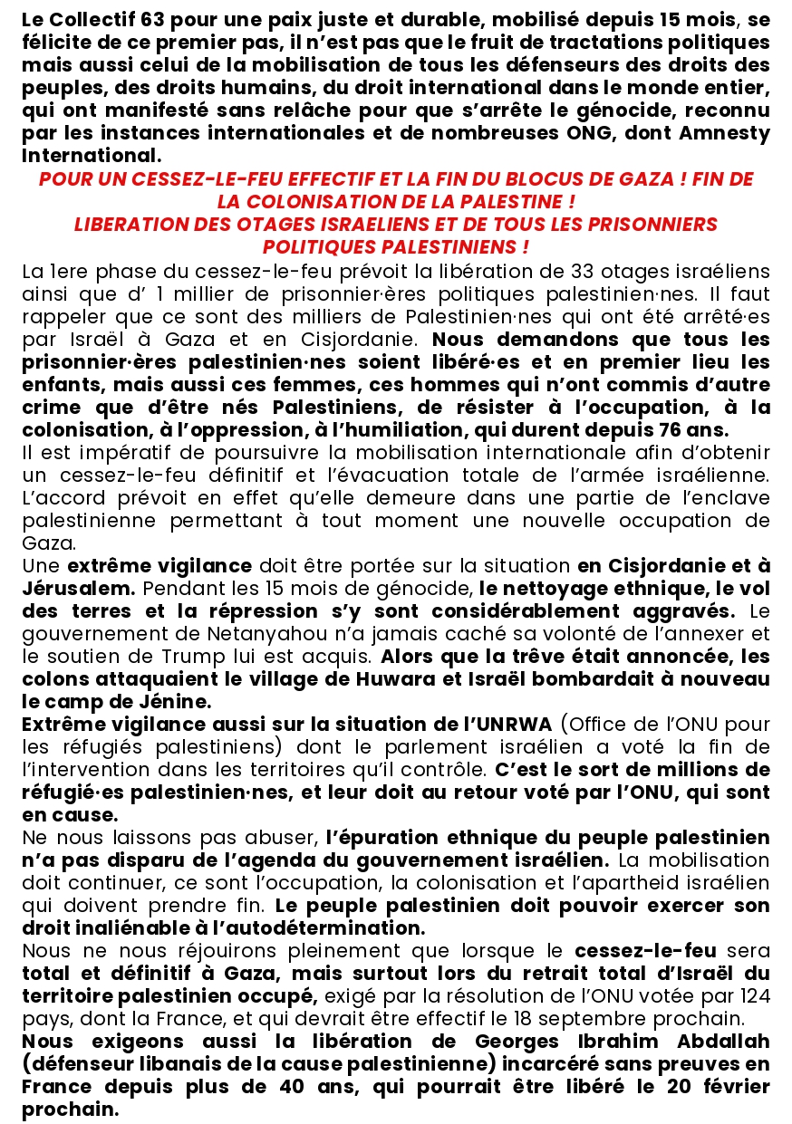 Vous êtes ici : Accueil Actualités actions Actualités Année en cours Palestine : Gaza, Cisjordanie, Jérusalem, restons mobilisé·es ! 23 janvier 2025 Actualités actions Palestine : Gaza, Cisjordanie, Jérusalem, restons mobilisé·es ! Imprimer l'article Rassemblement place de Jaude, Clermont-Ferrand, samedi 25 janvier 15h, à l’appel du Collectif pour une Paix juste et durable.