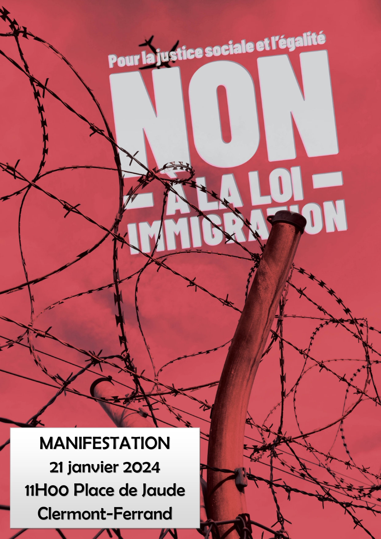 Le 21 janvier 2024, nos organisations syndicales, associatives et politiques du Puy de Dôme appellent à une mobilisation massive à partir de 11h00 Place de Jaude à Clermont-Ferrand pour le retrait de la loi Asile-immigration.