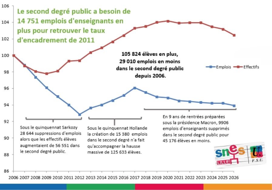 Pour la rentrée 2026, 4 018 suppressions d’emplois de professeures sont prévus dans le Projet de Loi de Finance (PLF) du gouvernement Lecornu, dont 1 645 dans le second degré. En 8 rentrées préparées par E. Macron, le nombre d’élèves a augmenté dans les collèges et les lycées (+8 865). Dans le même temps, 8 029 emplois de professeurs ont été supprimés dans le 2d degré. L’argument démographique a bon dos, il est surtout un prétexte à légitimer encore des fermetures de divisions et des suppressions d’emplois, certainement pas une baisse des effectifs par classe comme le SNES-FSU le revendique.