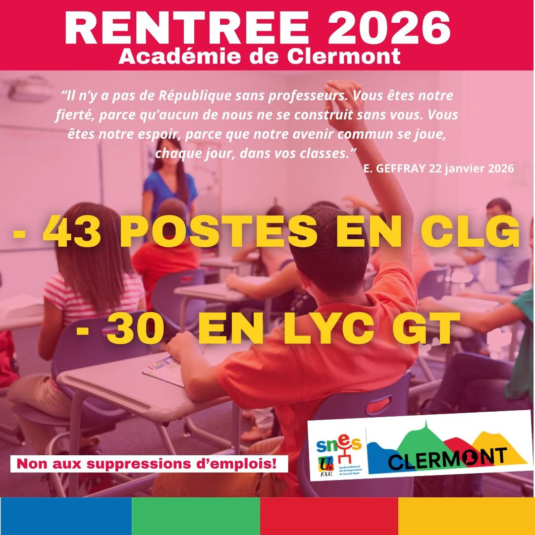 Les documents transmis par le rectorat sur les dotations des lycées généraux et technologiques donnent une orientation très inquiétante sur les conditions de rentrée 2026. De nombreux lycées subissent des pertes importantes, Madame de Staël à Montluçon (-77h) ; Banville à Moulins (-44h) ; Blaise de Vigenère à St Pourçain (-38h) ; Albert Londres à Cusset (-65,5h) ; C&A Dupuy au Puy (-76h) ; E. Chabrier Yssingeaux (-39h) ; E. Duclaux à Aurillac (-40,54h) ; J. Monnet à Aurillac (-23,87h) ; S. Apollinaire à Clermont (-80h) ; La Fayette à Clermont (-103h) ; Virlogeux à Riom (-78h) ; Montdory à Thiers (-81h) et Jean Zay à Thiers (-33h).
