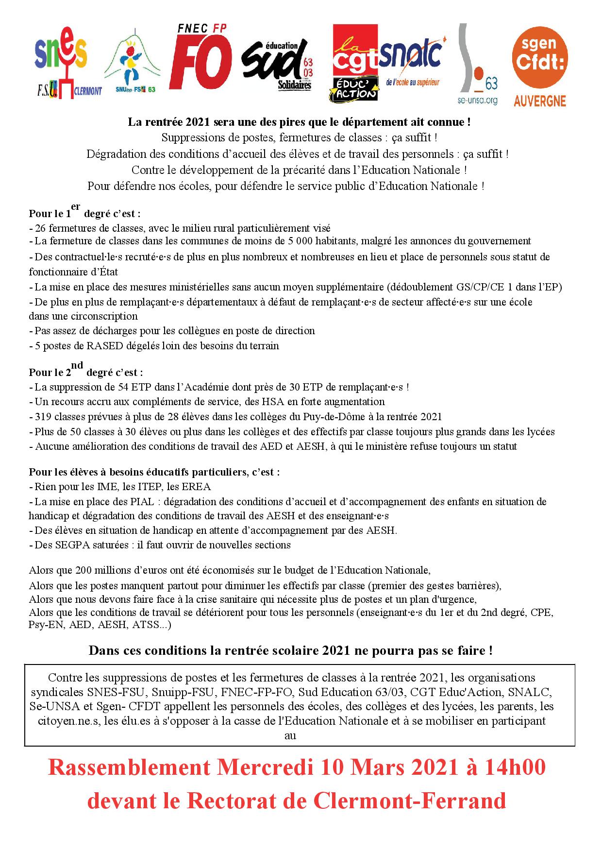 Contre les suppressions de postes et les fermetures de classes à la rentrée 2021, les organisations syndicales SNES-FSU, Snuipp-FSU, FNEC-FP-FO, Sud Education 63/03, CGT Educ’Action, SNALC, Se-UNSA et Sgen-CFDT appellent les personnels des écoles, des collèges et des lycées, les parents, les citoyen.ne.s, les élu.es à s’opposer à la casse de l’Education Nationale et à se mobiliser en participant au Rassemblement :