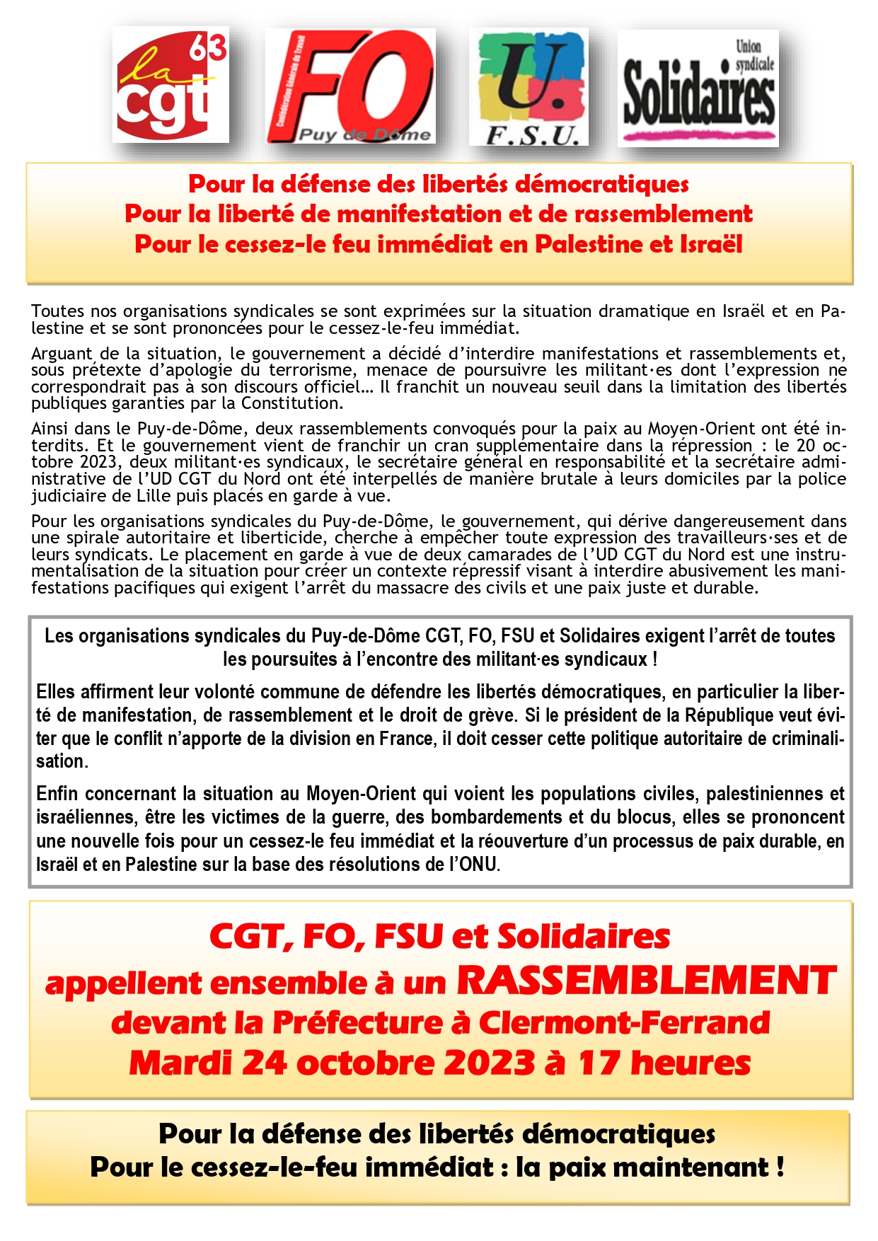 Les organisations syndicales du Puy-de-Dôme CGT, FO, FSU et Solidaires exigent l’arrêt de toutes les poursuites à l’encontre des militant∙es syndicaux !