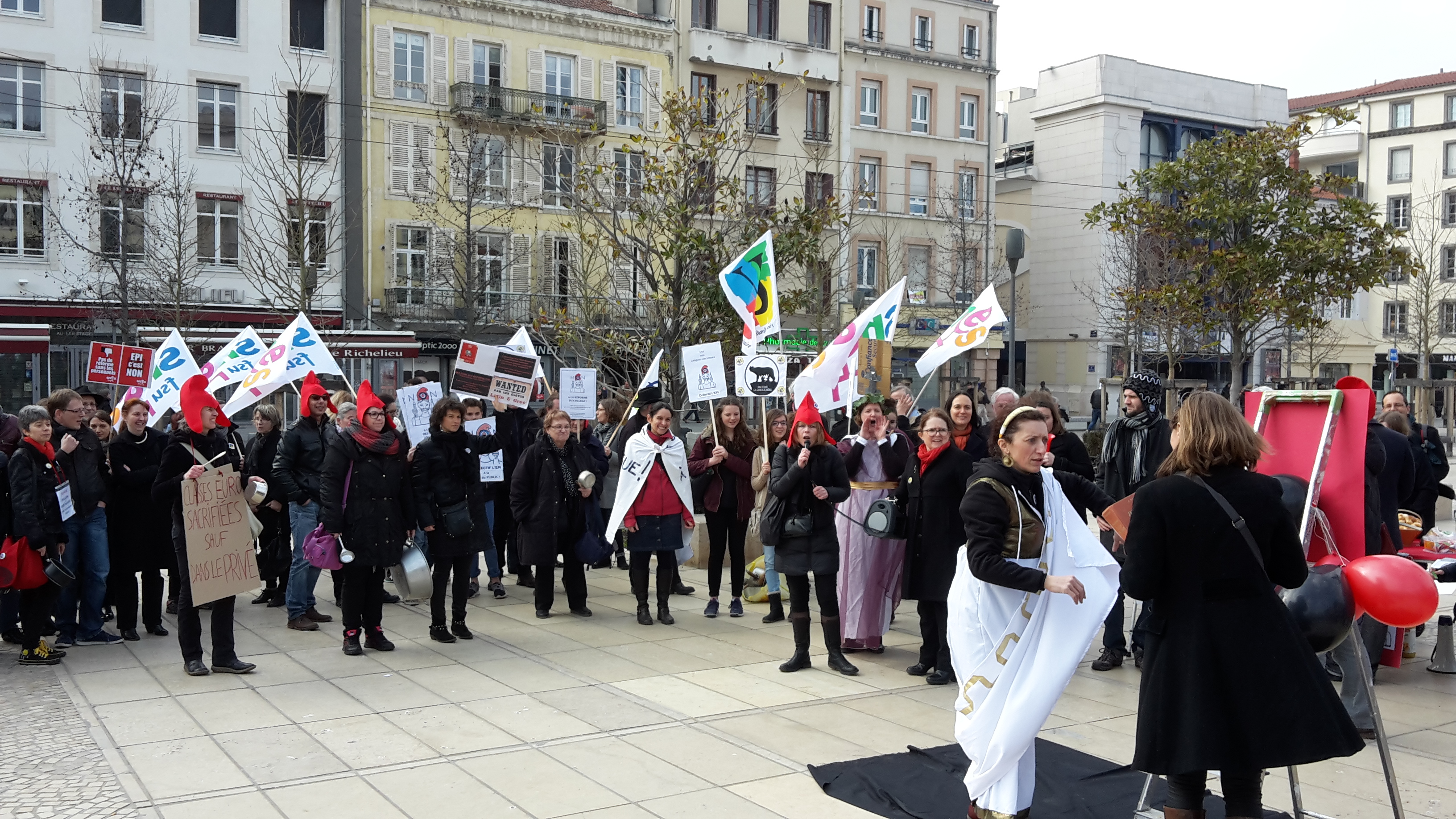 Environ 200 personnes, professeurs, parents, militant-e-s, citoyen-ne-s, se sont rassemblées ce samedi Place de Jaude pour demander une nouvelle fois l’abrogation de la réforme du collège.