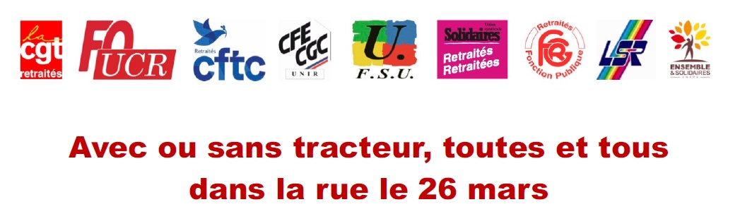 Les 9 organisations de retraitées, CGT, FO, CFTC, CFE-CGC, FSU, Solidaires, FGR-FP, LSR, Ensemble & Solidaires, appellent à l’action le 26 mars.