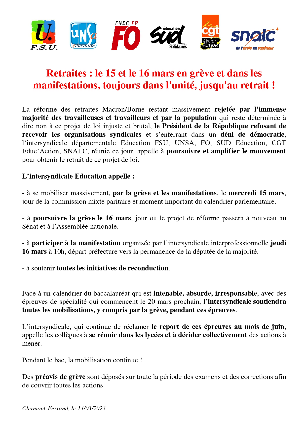– à se mobiliser massivement, par la grève et les manifestations, le mercredi 15 mars, jour de la commission mixte paritaire et moment important du calendrier parlementaire.