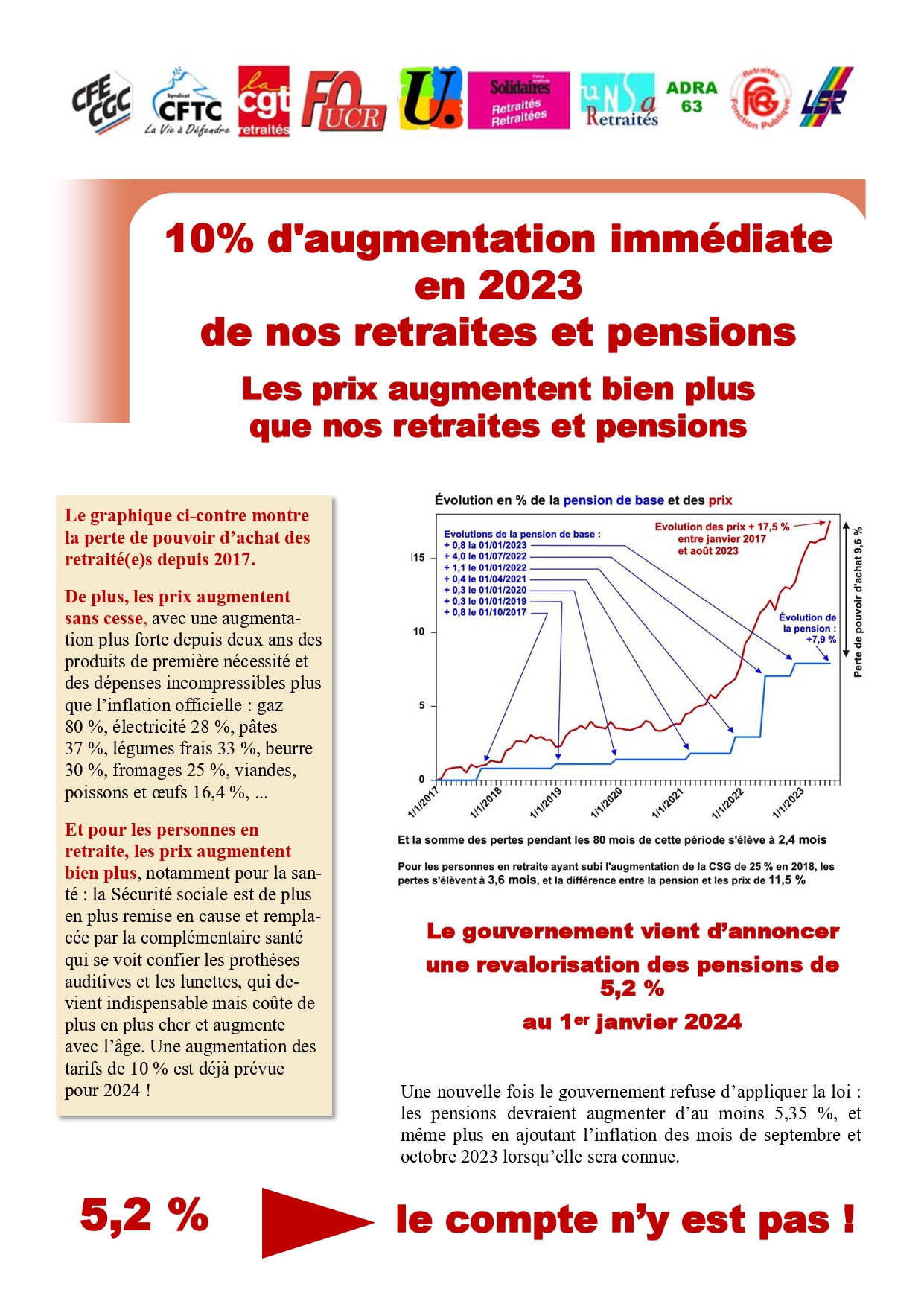 10% d’augmentation immédiate en 2023 de nos retraites et pensions !