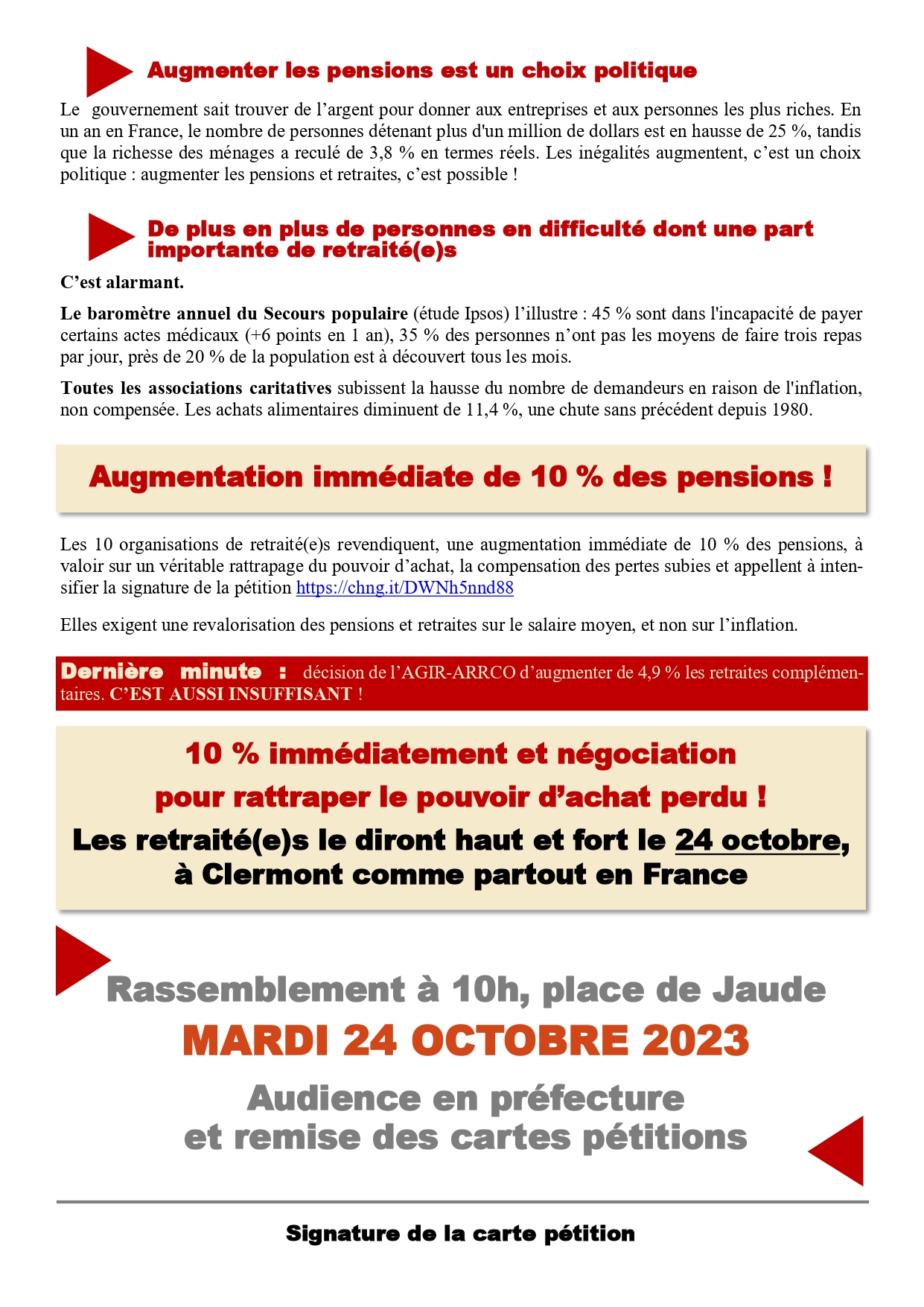 Rassemblement à 10h, place de Jaude MARDI 24 OCTOBRE 2023