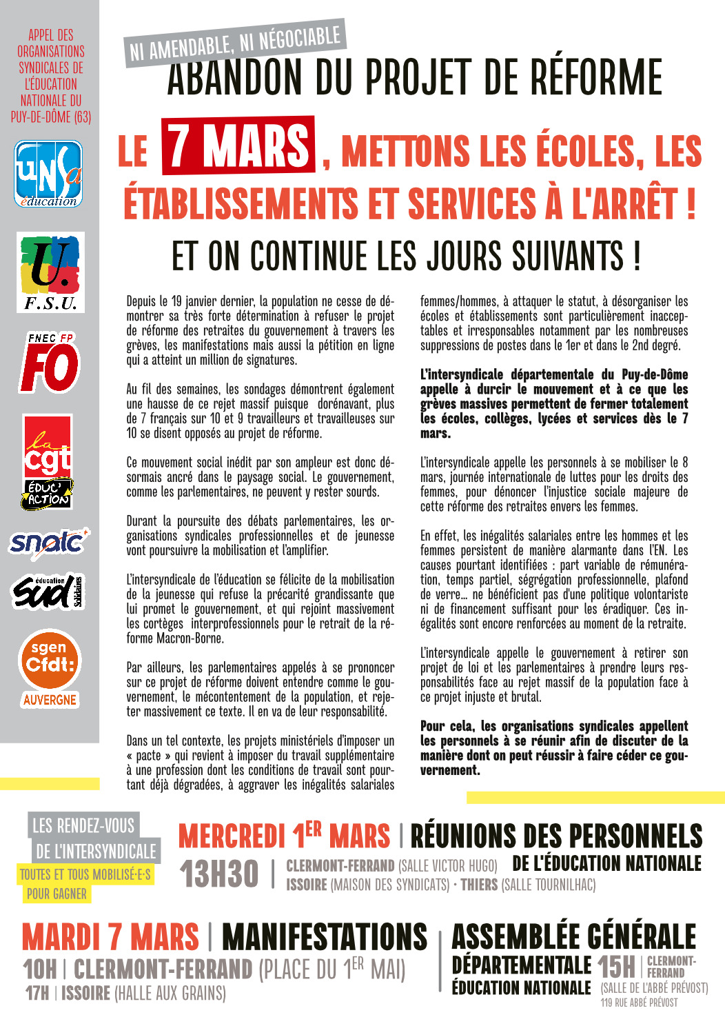 L’intersyndicale départementale du Puy-de-Dôme appelle à durcir le mouvement et à ce que les grèves massives permettent de fermer totalement les écoles, collèges, lycées et services dès le 7 mars.