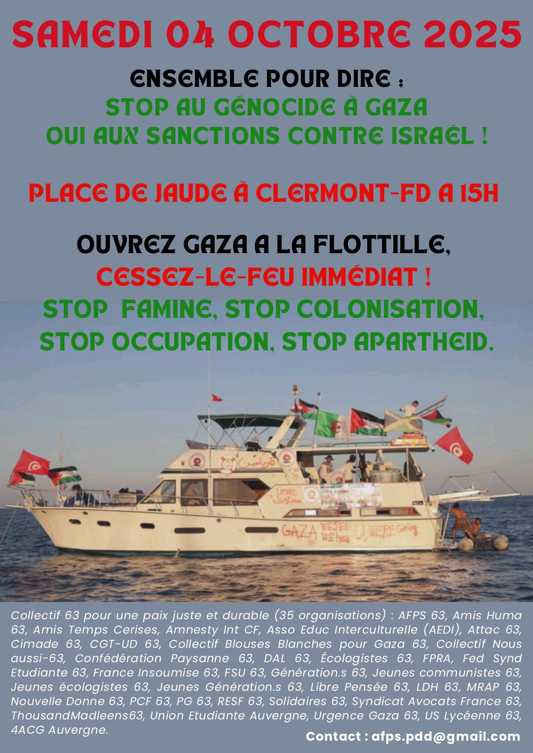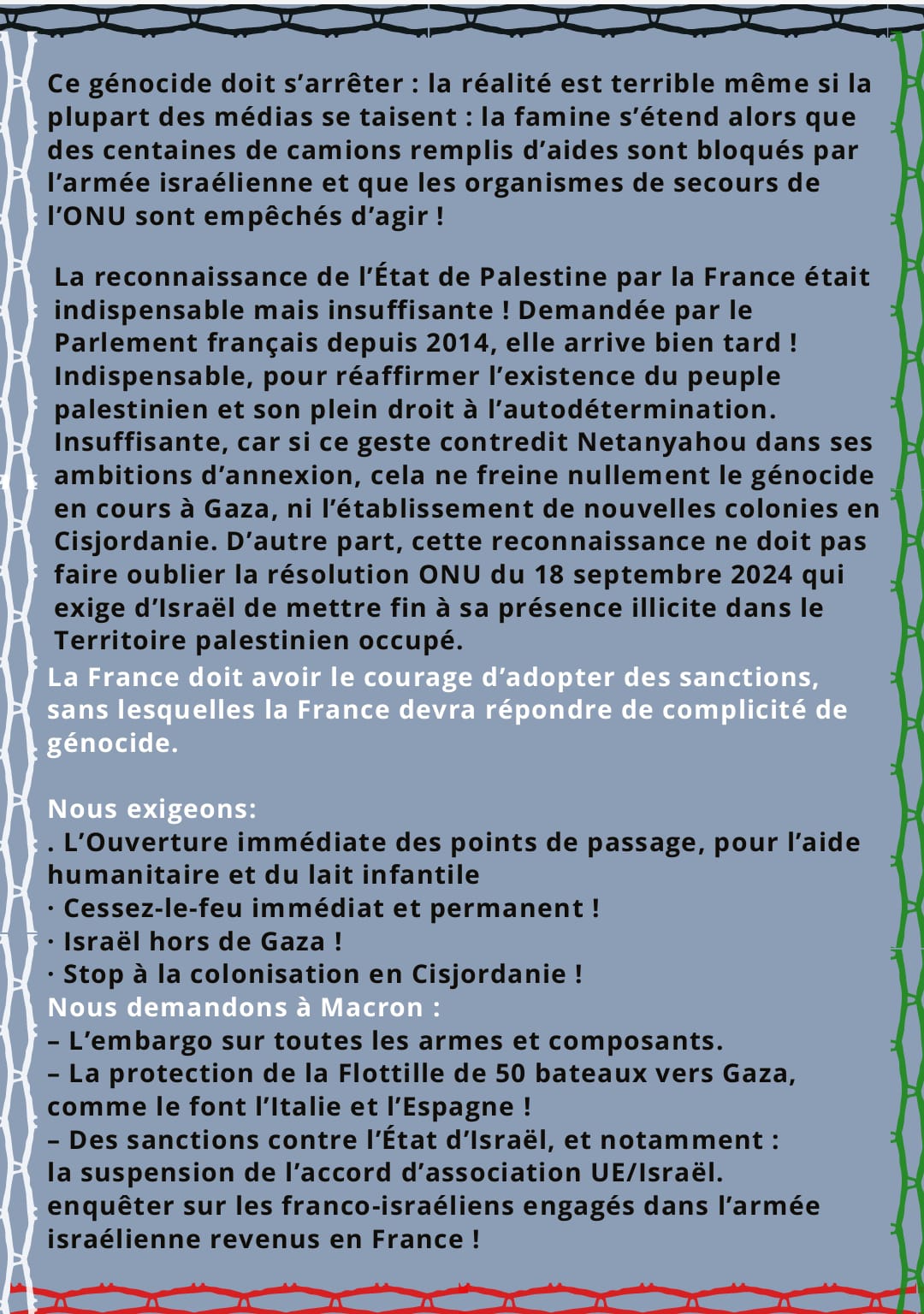 Elle appelle à se joindre aux mobilisations de solidarité avec la flottille qui sont organisées partout en France et à investir massivement la mobilisation du samedi 4 octobre appelée par le collectif national pour une paix juste et durable entre Palestiniens et Israéliens, pour exiger la fin du génocide.