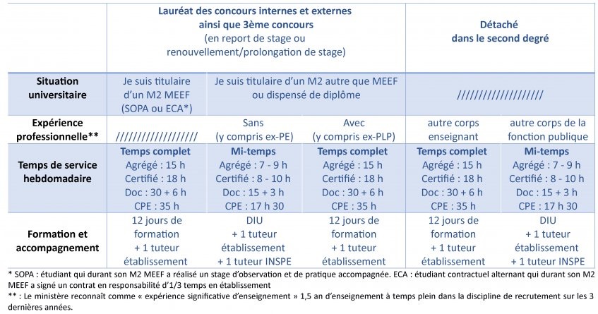 En ce qui concerne votre formation, les stagiaires à mi-temps (pour les titulaires d’un Master autre que MEEF ou dispensés de diplôme) devront se rendre à l’INSPE chaque semaine, les stagiaires à temps plein auront entre 10 et 20 jours de formation pendant l’année.